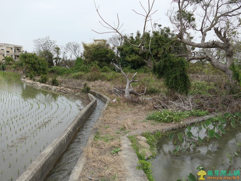 ▲沿稻田與芋頭田間水溝旁小路前行,進入一片荒廢的菜園耕地。