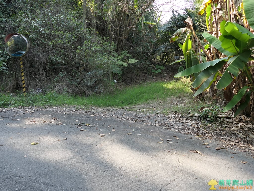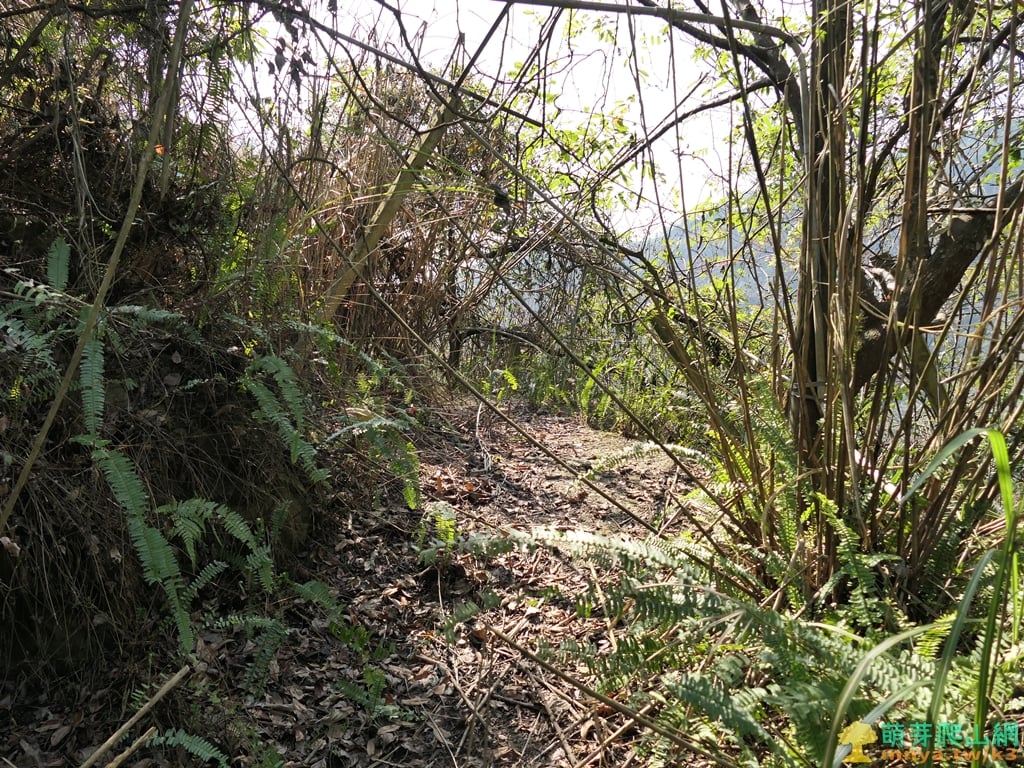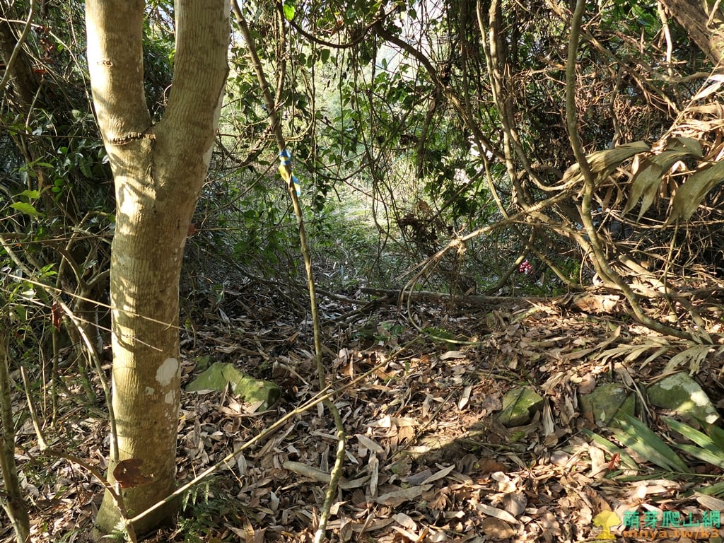 ▲順北稜走離開廢棄果園進入雜木林,林相總算是明朗許多,左下方可見停車的左彎道。