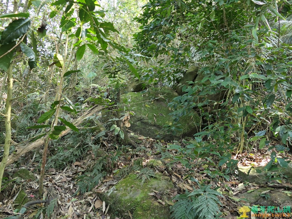 ▲15:04,上行鑽入一片密不透風的藤蔓叢中,山坡亂石錯落只能緩慢開路前行,往前遇大石如一道屏障。(回程拍攝)