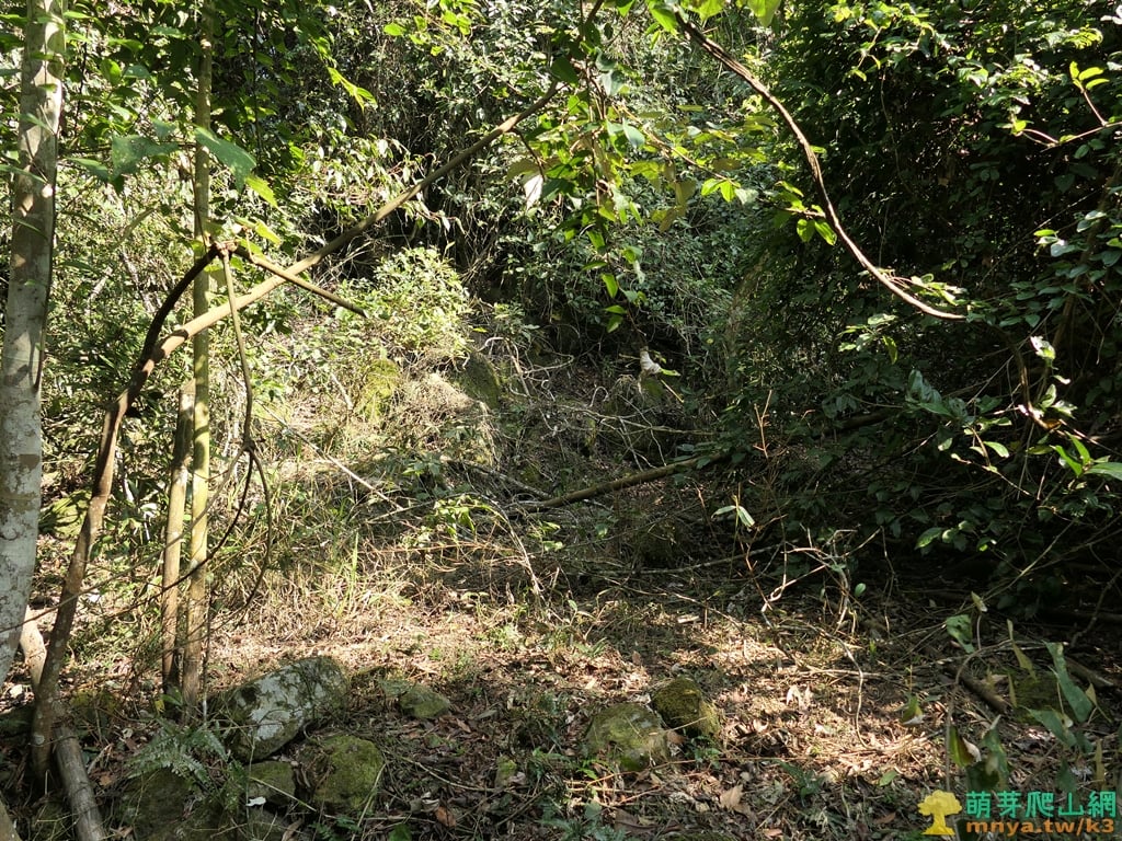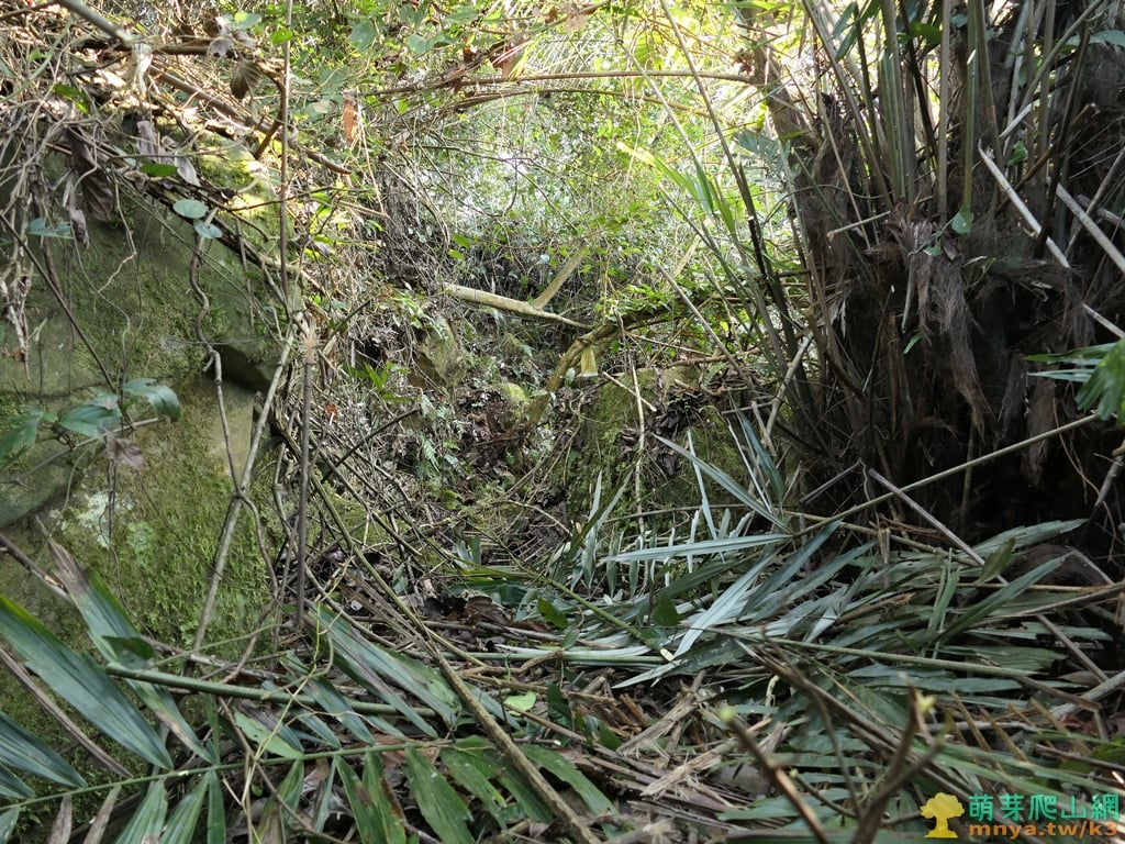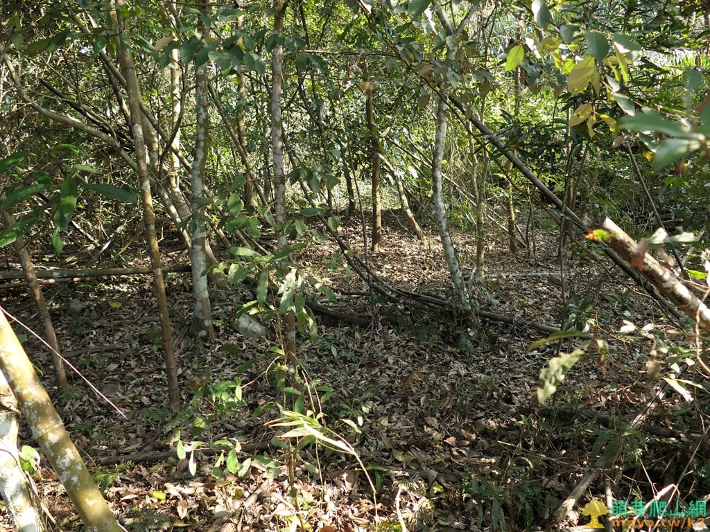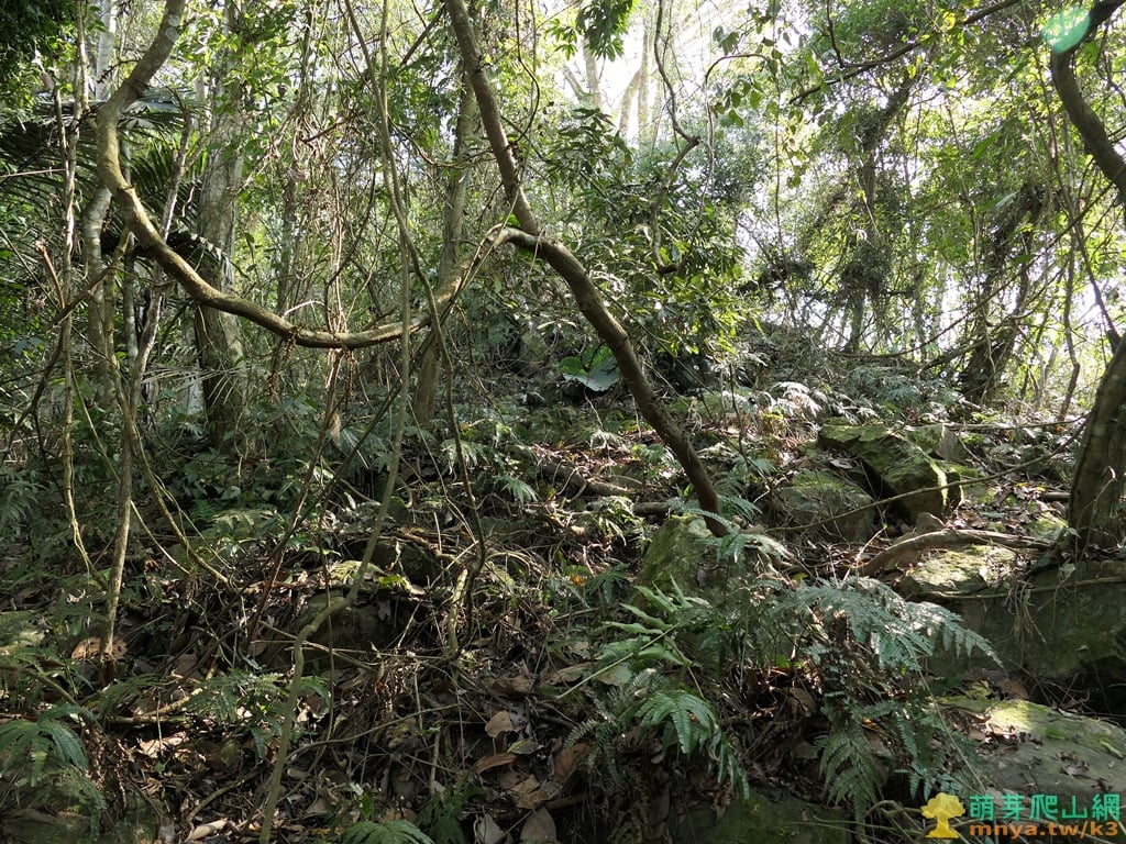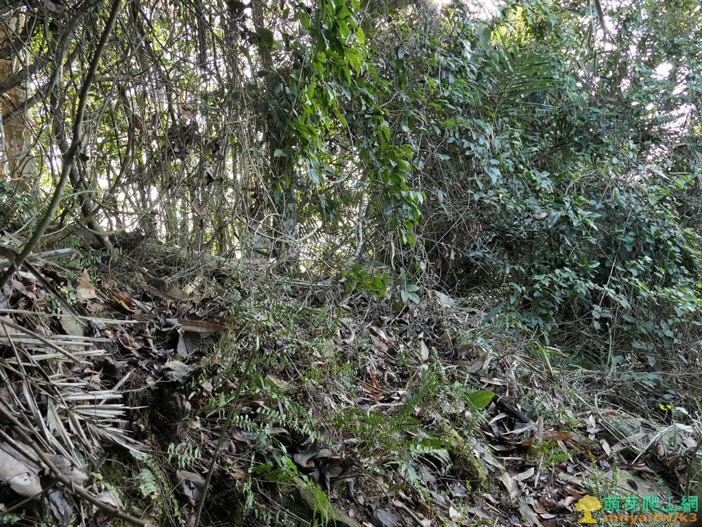 ▲直入山谷地形向左前方緩上坡,進入樹林底四周長滿藤蔓叢林,至上山頂前的最後障礙。
