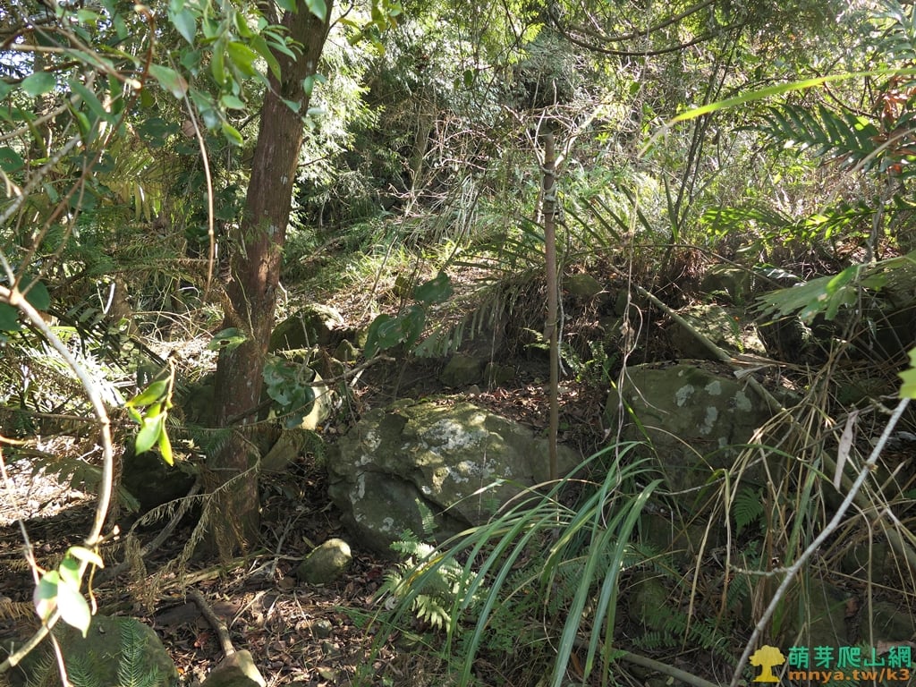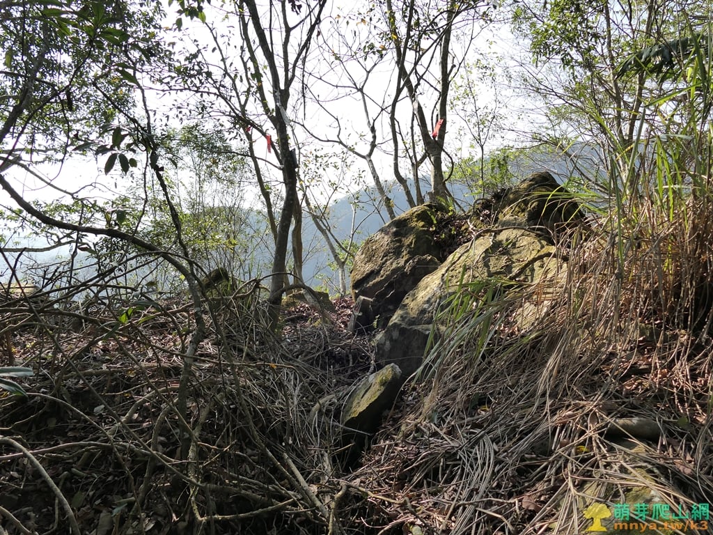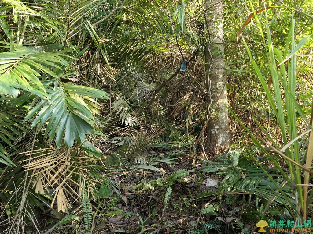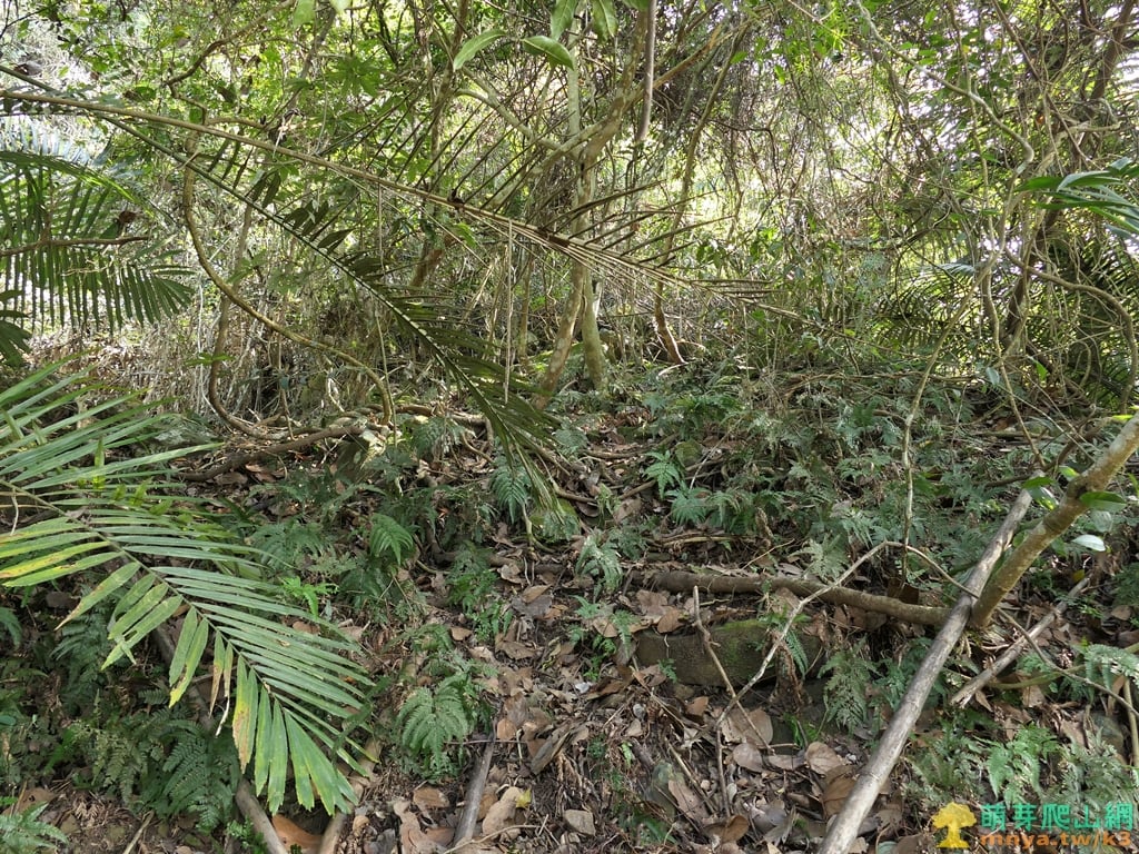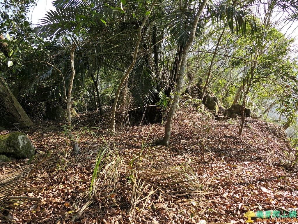 ▲上至山頂平台前方有一叢山棕需繞過,基點位於右後方的大石處,左下則是山友從果園上來的路線。