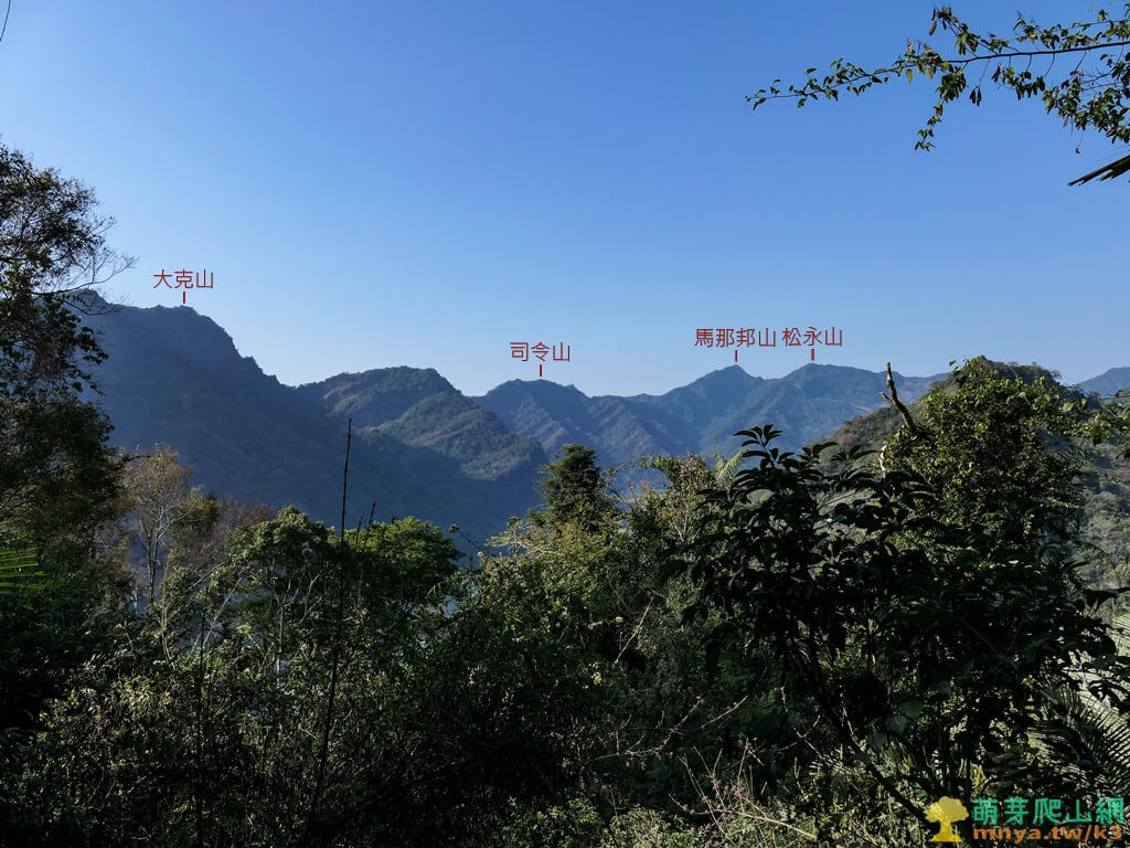 ▲上乾淨林相前回望樹林開口,向西北眺望大安溪對面馬克縱走的稜線,自南向北可見:大克山(1236M)、司令山(1183M)、馬那邦山(馬拉邦山;1407M),及馬那邦山東稜延伸出去的松永山(1357M)。