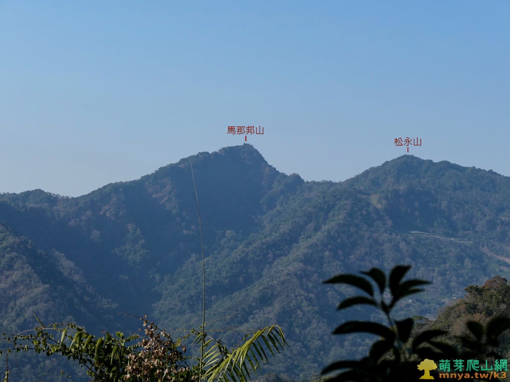 ▲拉近眺望馬那邦山(馬拉邦山;1407M)與松永山(1357M),馬那邦山擁有一等三角點為小百岳之一,是苗栗地區相當熱門的中級山。