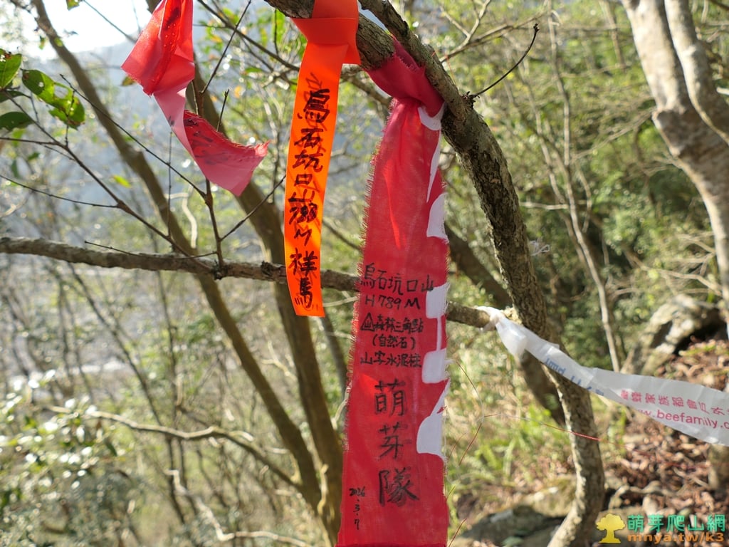▲15:26,繞過山頂平台的山棕叢後,向右稍低處大石後方、靠近山崖邊即可見烏石坑口山山字水泥柱,至於森林三角點為自然石,及山字水泥柱後方的石塊有十字刻痕,上山費時1小時20分鐘。