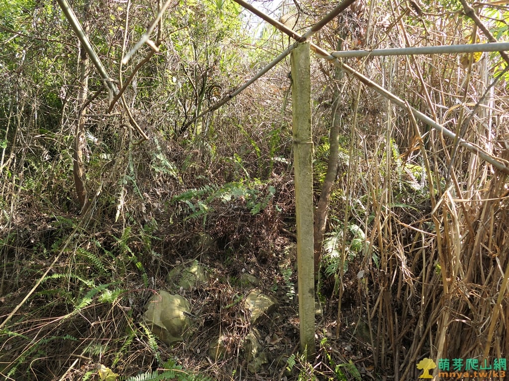 ▲14:11,向上一小段路鑽過廢棄果園鐵架,經設有電表的木電桿,取直繼續沿果園邊向上遇高密芒草。