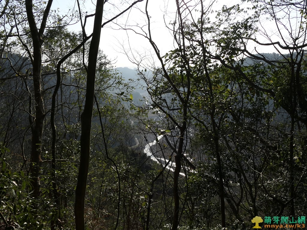 ▲烏石坑口山俯瞰西南邊的大安溪谷,溪左岸可見中47線(東崎路二段),約略可見跨越大安溪的白布帆大橋,遠處能眺望尾文坑山等地。