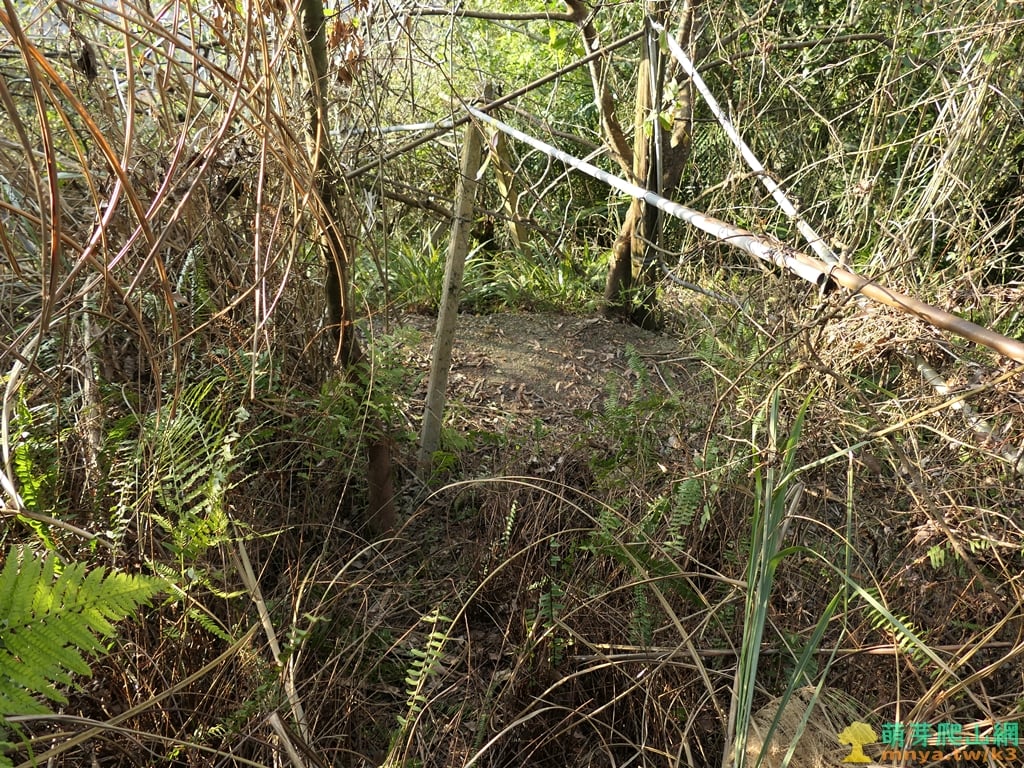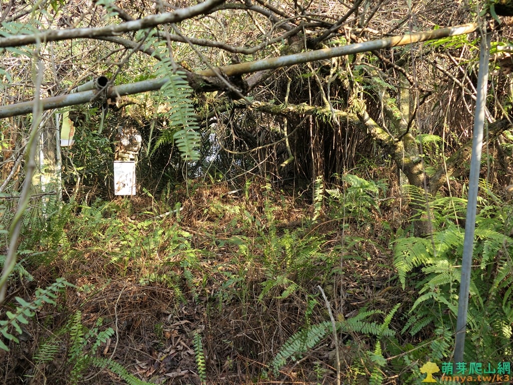 ▲16:36,下行回到荒廢果園雜草區,經過山坡地上的水管、鐵皮鐵架、鍋具等廢棄物,右側雜草叢開口略有展望。