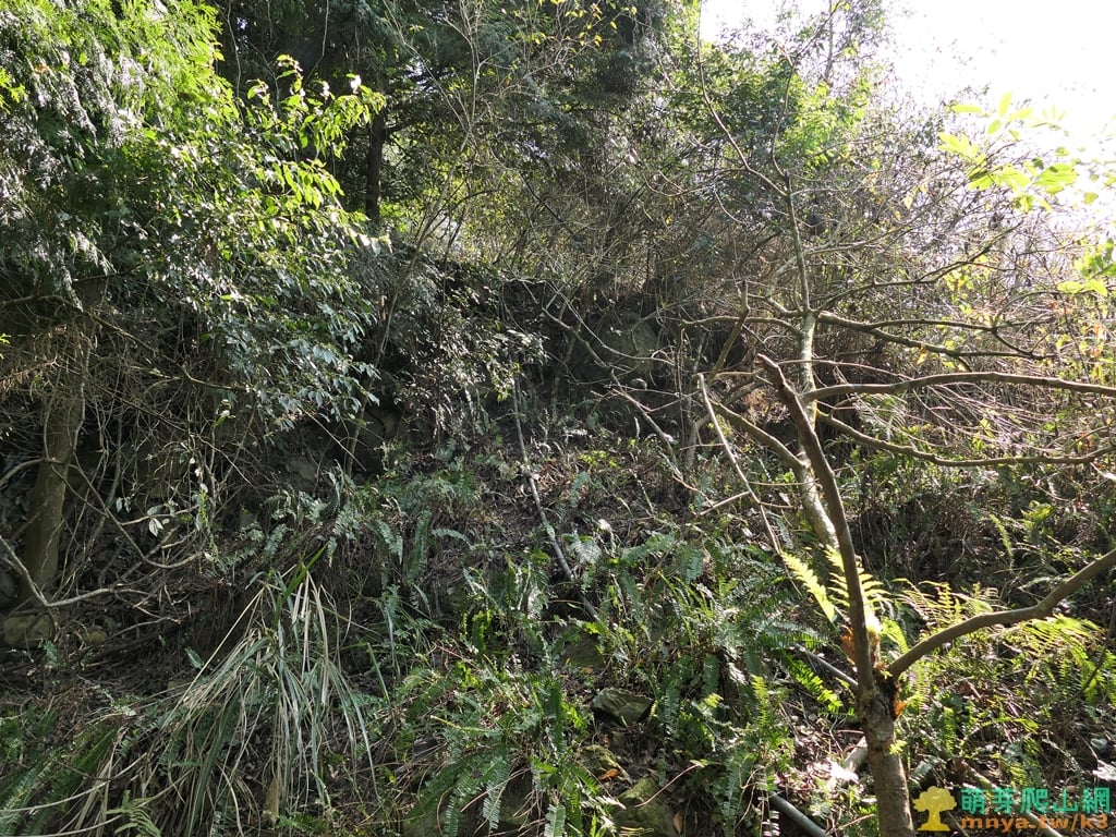 ▲繼續陡上較乾淨的山坡,左側有一小片的石壁。