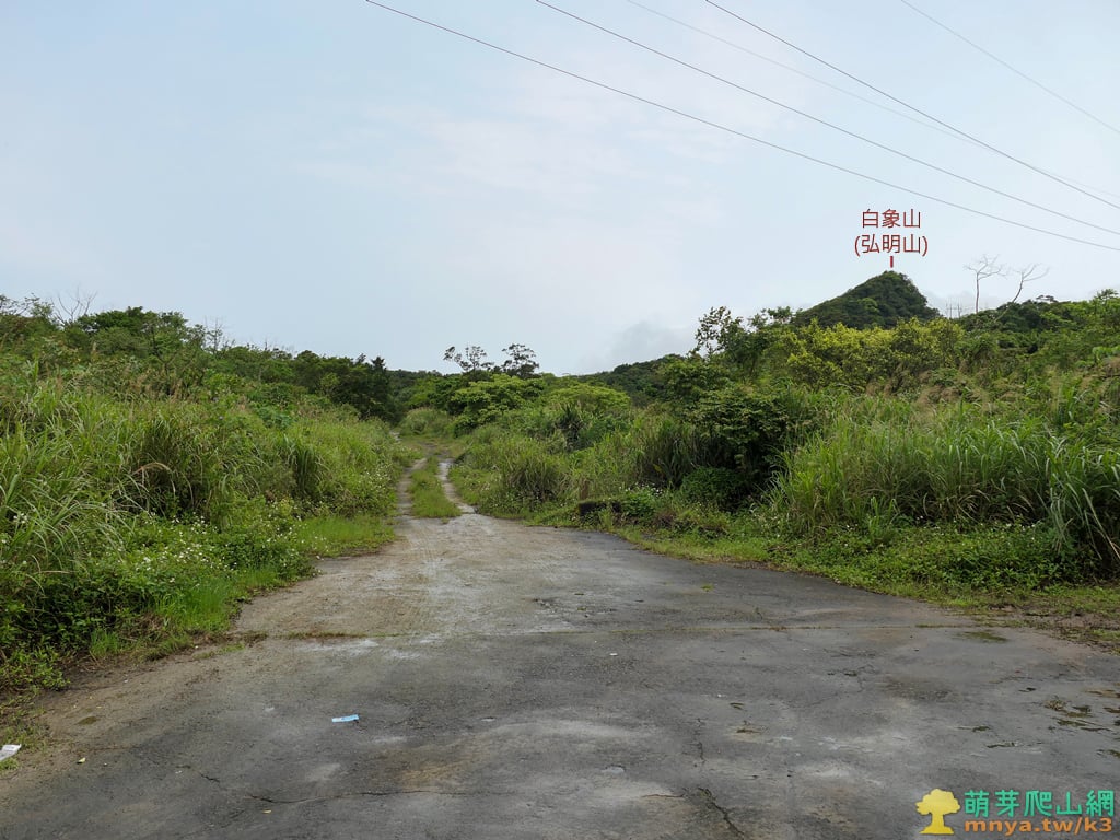 ▲12:59,經過瑞芳第一公墓與廢棄水泥牌樓後空地停車,取直續行的道路轉為荒蕪改步行進入,停車點直距鹿仔寮山約0.59K,右前方可見待會的目標白象山(弘明山;172M)。