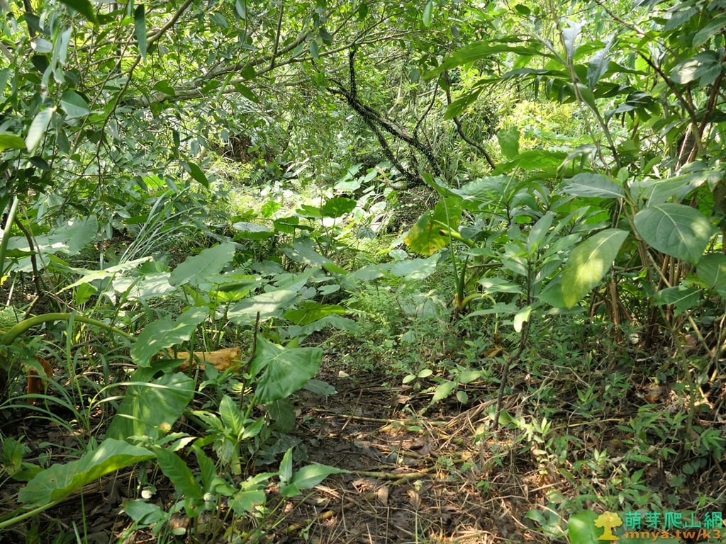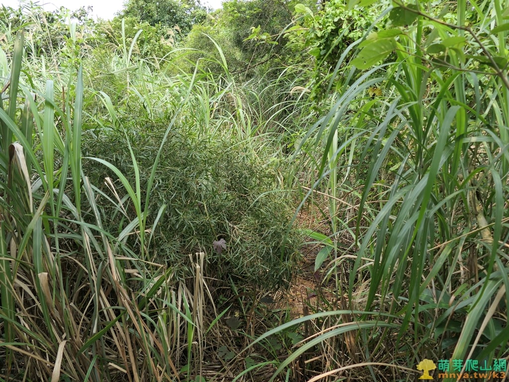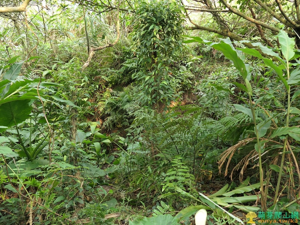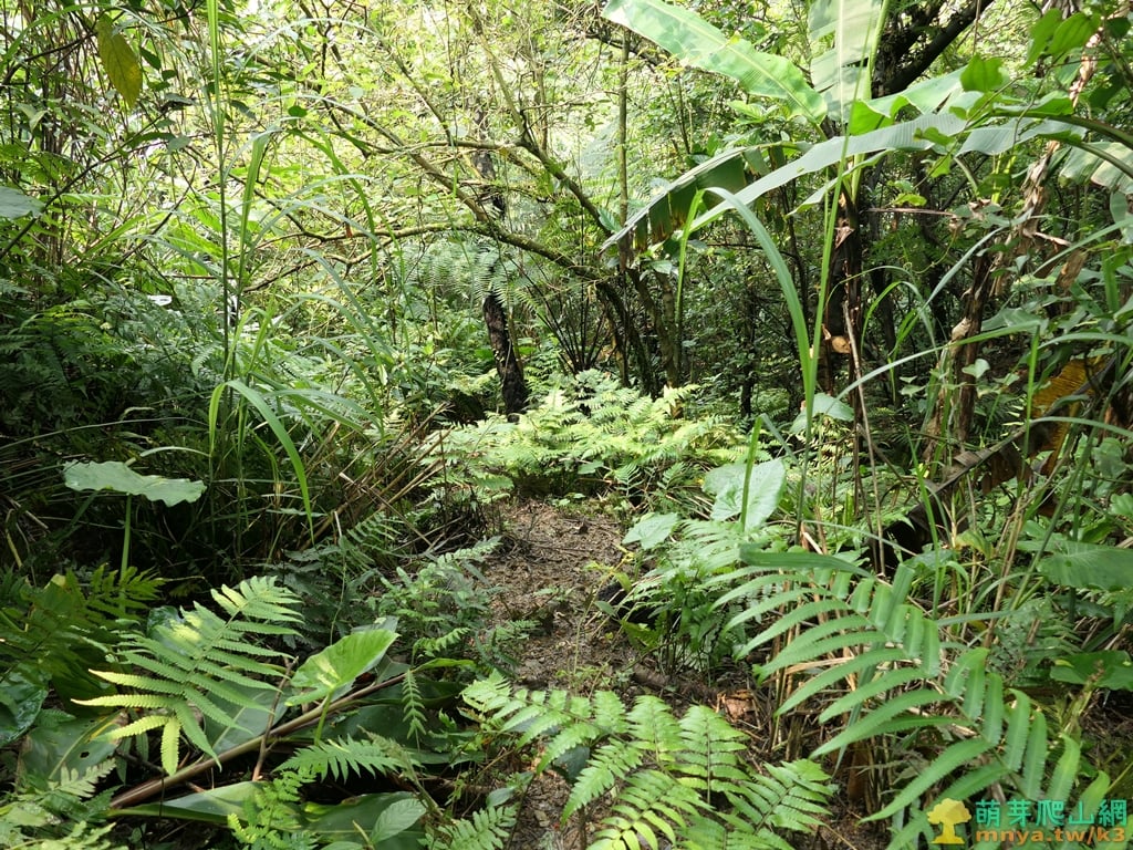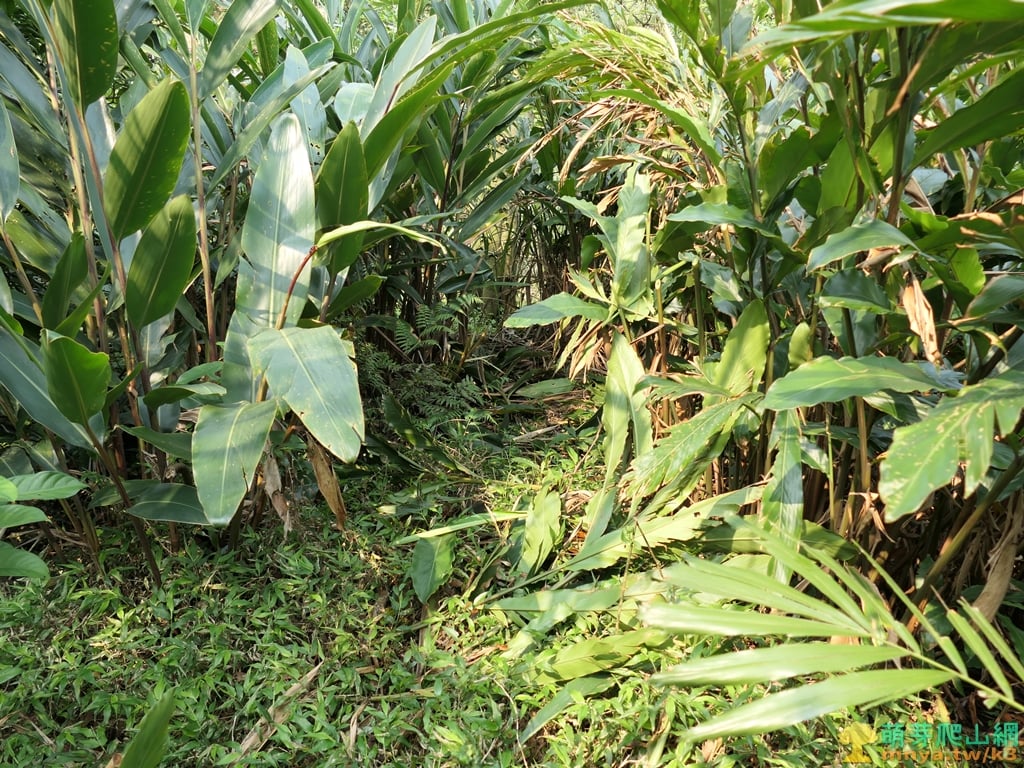 ▲越過山溝後上到另一處平台,隨即左下有一階階的梯田地形,只是都已荒廢長滿月桃叢。
