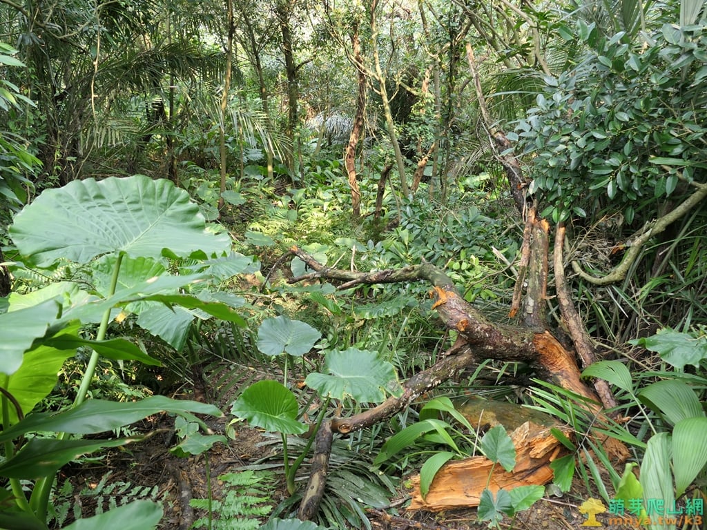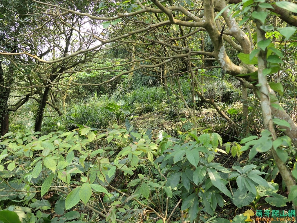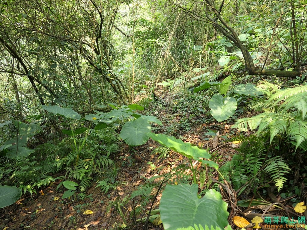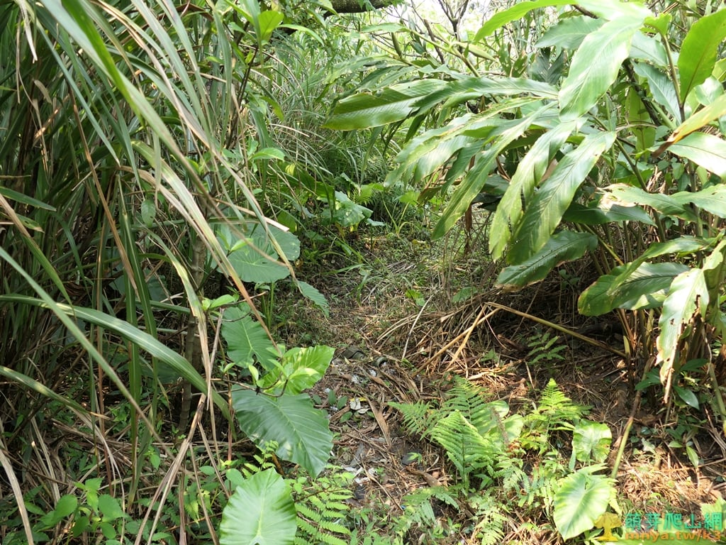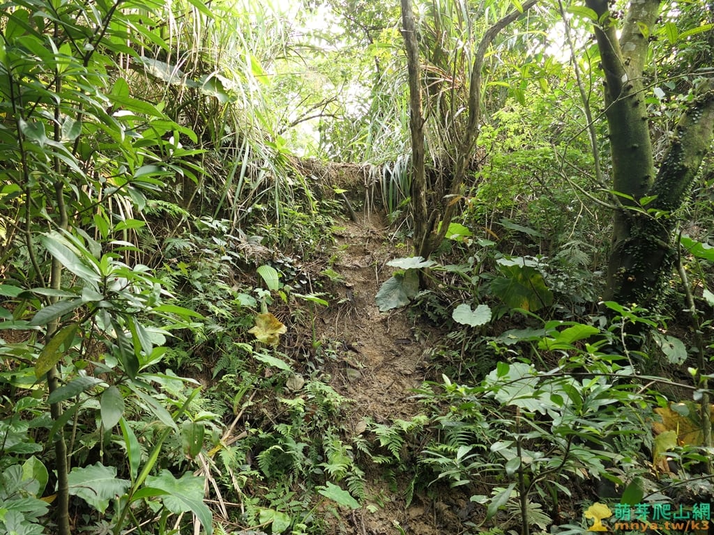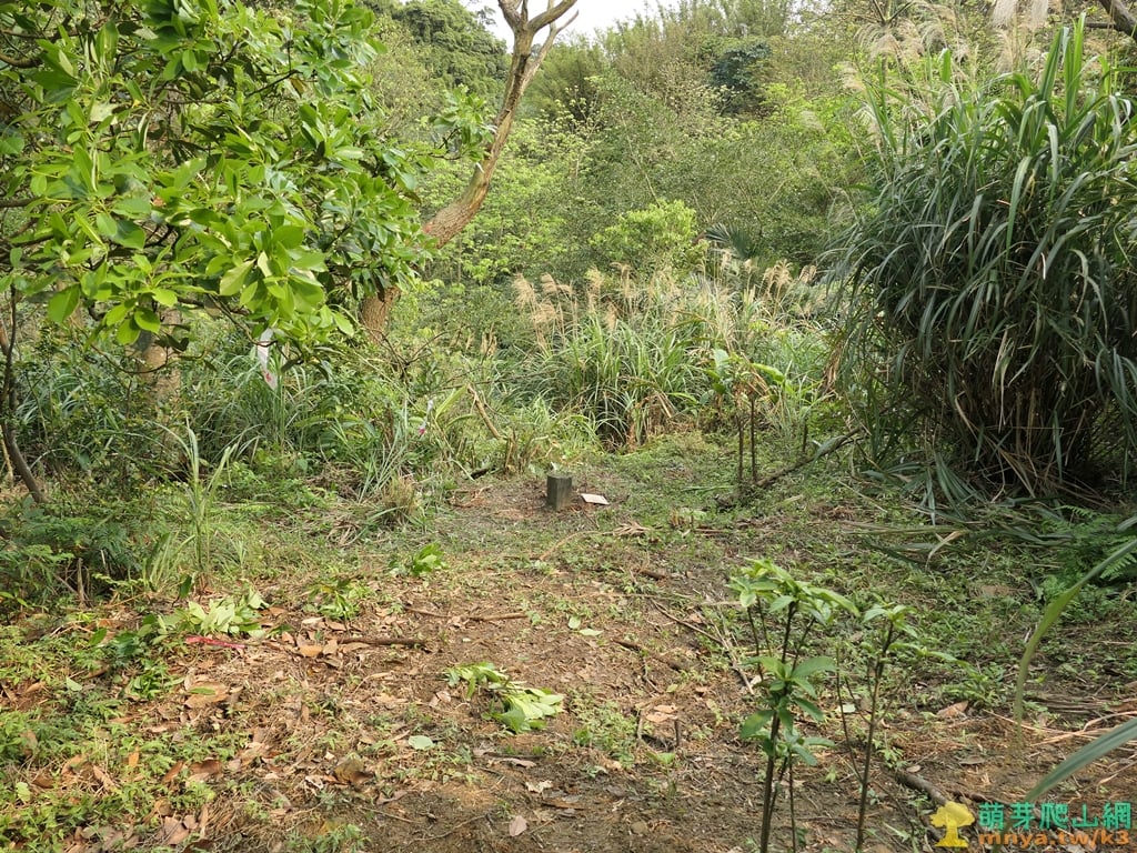 ▲越過山溝後上到另一處平台,隨即左下有一階階的梯田地形,只是都已荒廢長滿月桃叢。