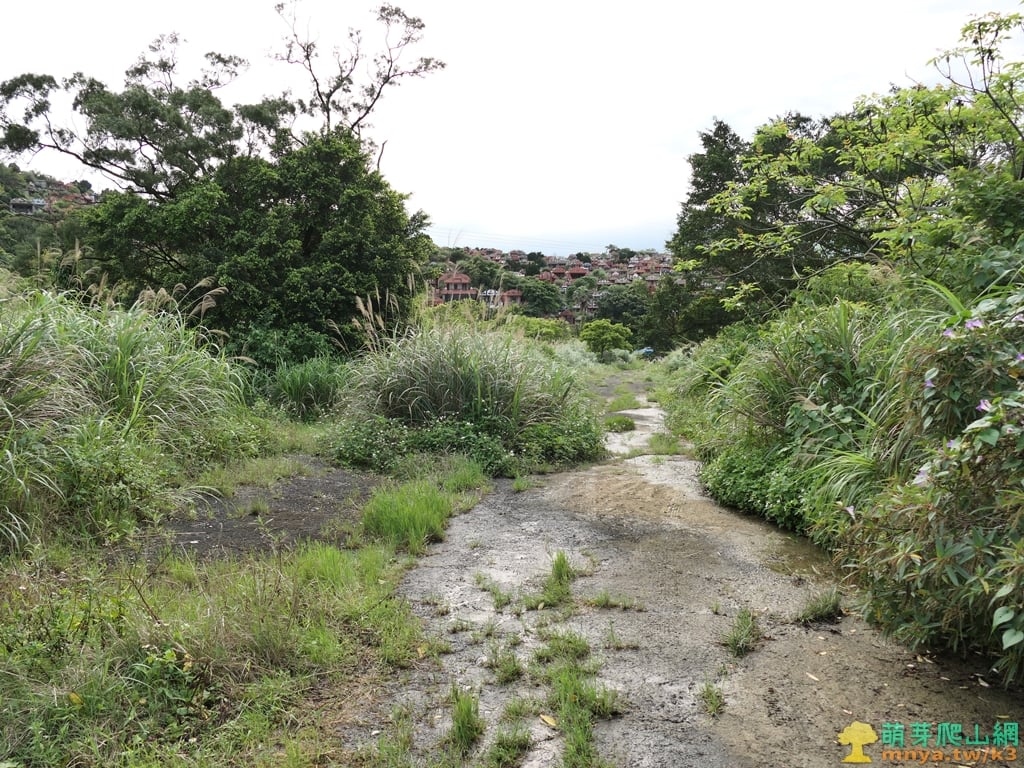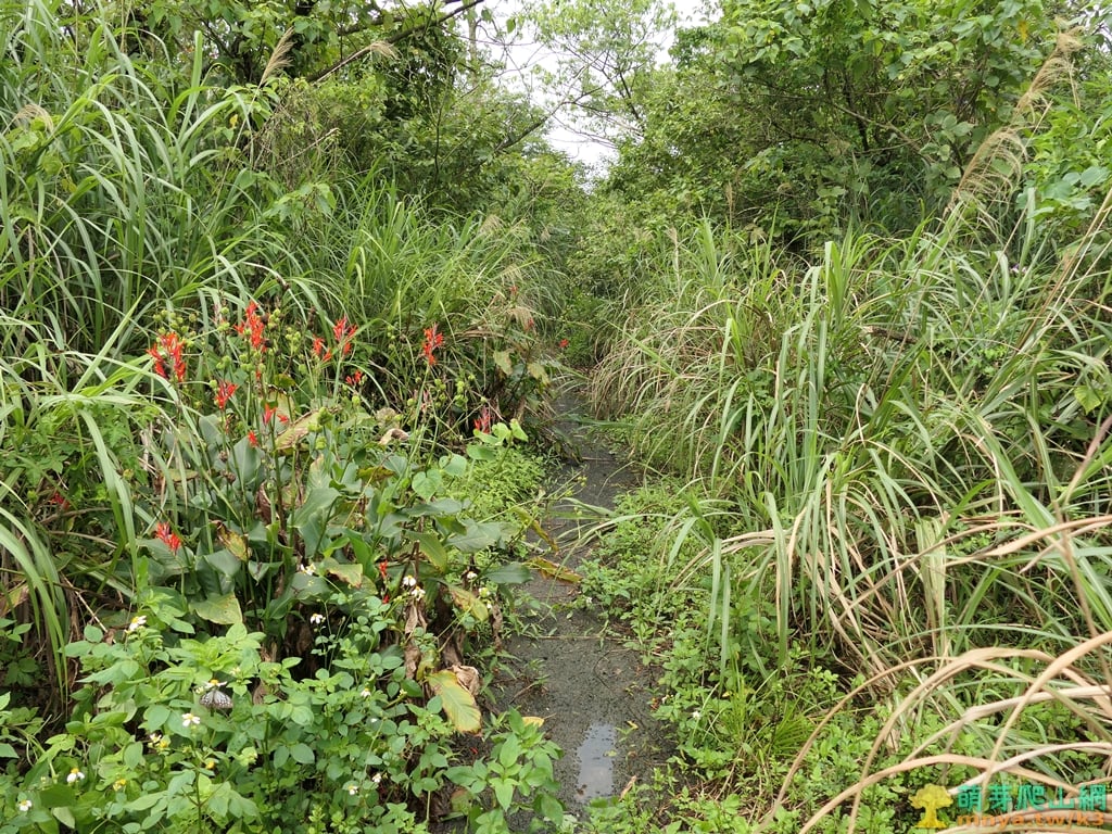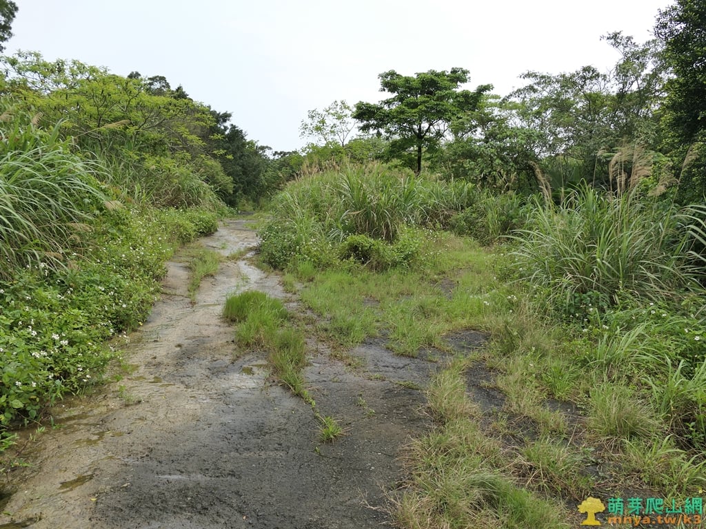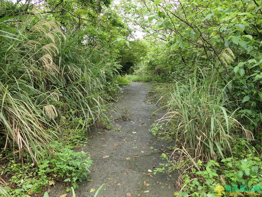 ▲直走緩上的水泥路,兩側雜草夾道越前進草越多,至0.3K處左彎。