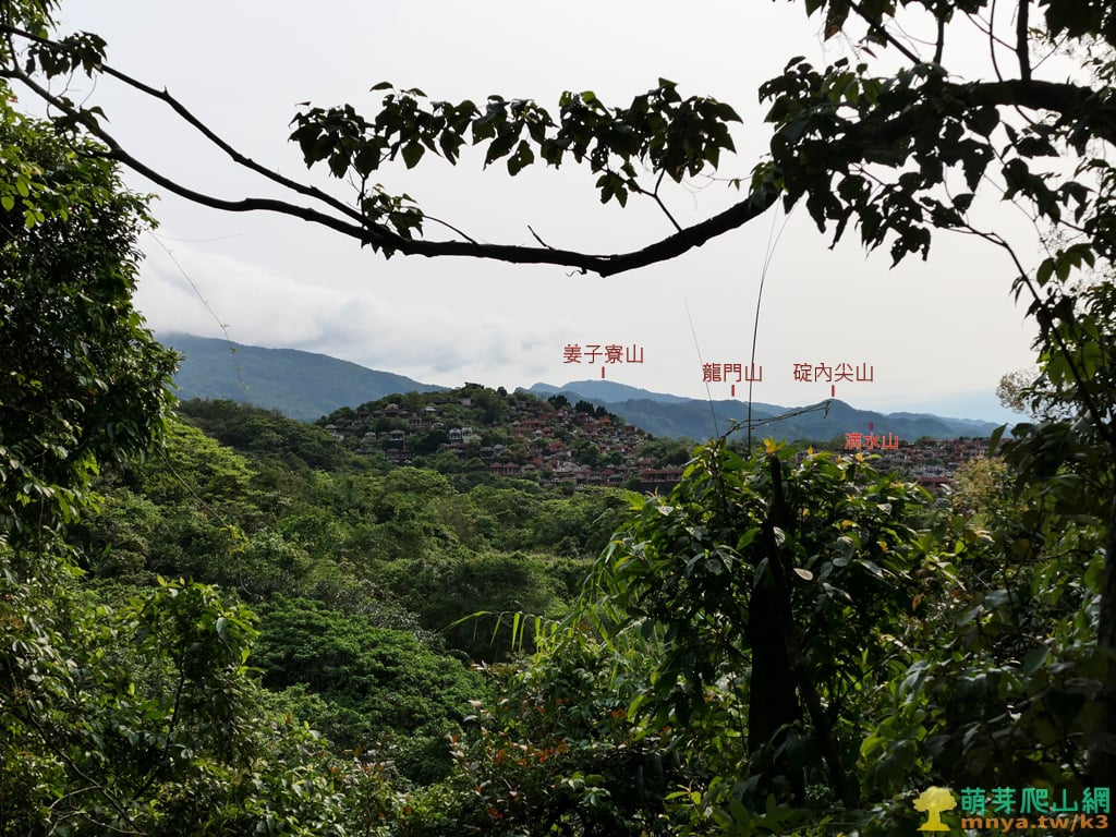 ▲14:59,回越過支稜點,此處山坡略有展望可往西南眺望瑞芳第一公墓,後方可見基隆河左岸的滴水山(249M),與瑞芳、暖暖交界的龍門山(380M)、碇內尖山(360M),最遠可見小百岳之一的姜子寮山(729M)。