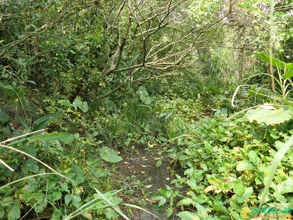 ▲沿山溝邊向左下切,仍有明顯路徑可循,前日大雨路面爛泥濕濘。