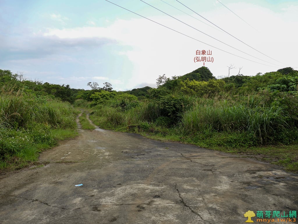▲15:36,爬完鹿仔寮山後回停車處休息一下,再續行荒廢的水泥路往0.12K岔路走,停車處向右前方可見目標山頭白象山(弘明山;172M),由此直距約0.46K。