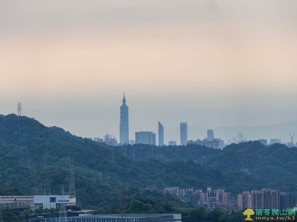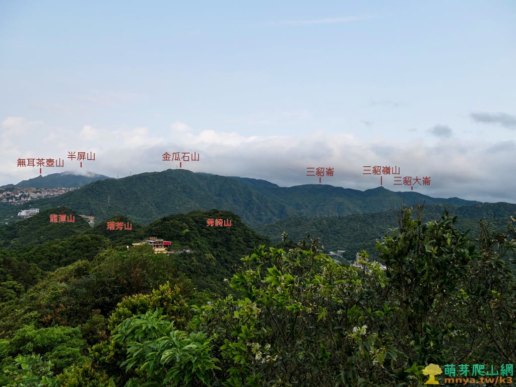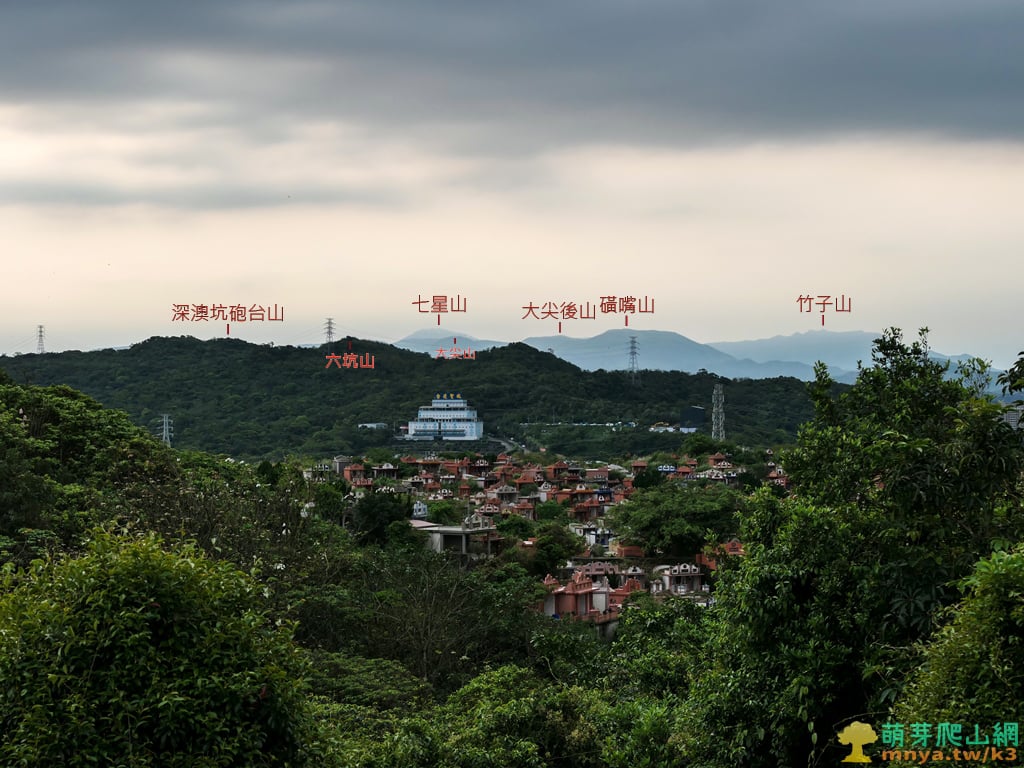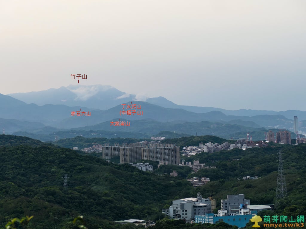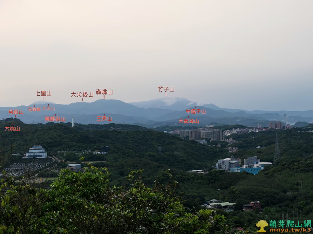 ▲往西拉近看大屯火山群方向,近處可見台北聖城與六坑山(182M);月眉山(215M)與天外天焚化廠煙囪,後一層山稜可見基隆七堵與新北萬里交界的開眼尖山(411M)至三界山(362M)連稜,最遠可見石梯嶺(862M)、七星山(1120M)、大尖山(837M)、大尖後山(885M)、磺嘴山(912M)、竹子山(1103M)等山。