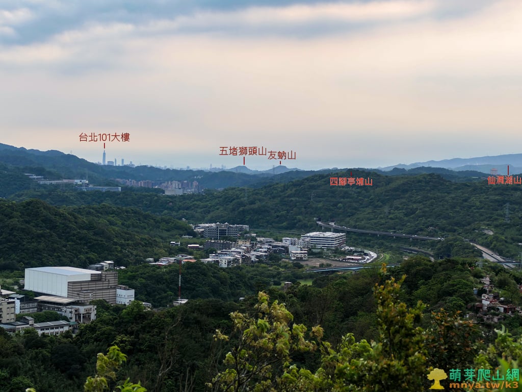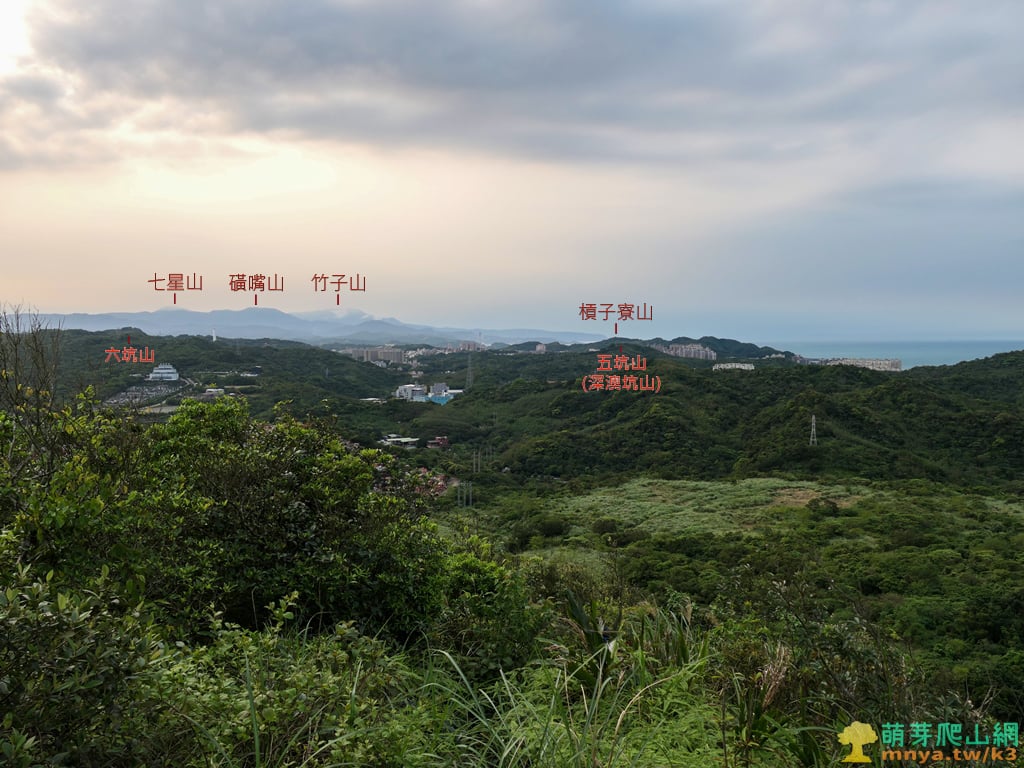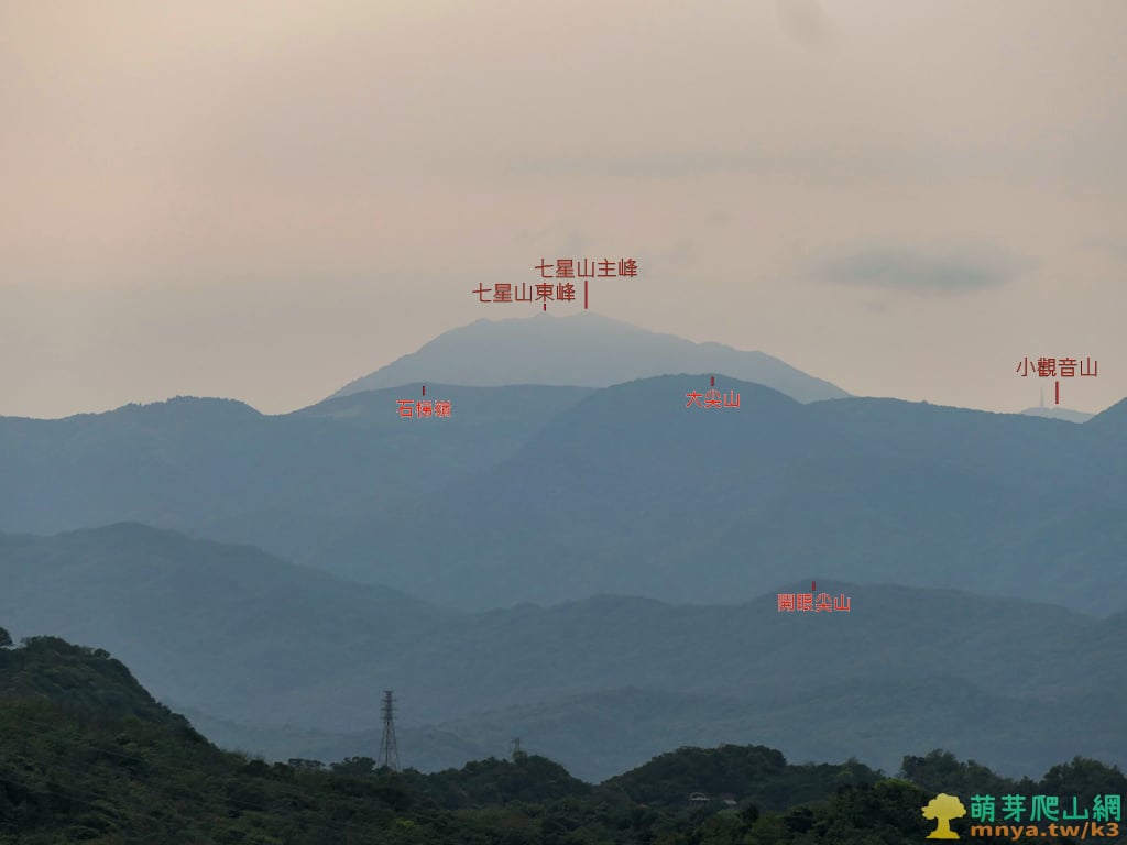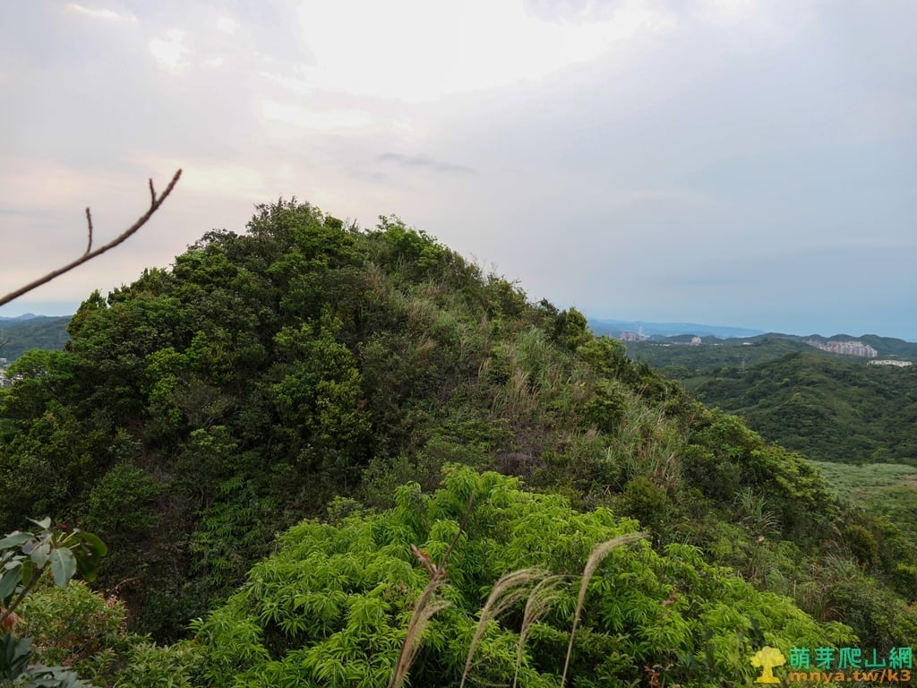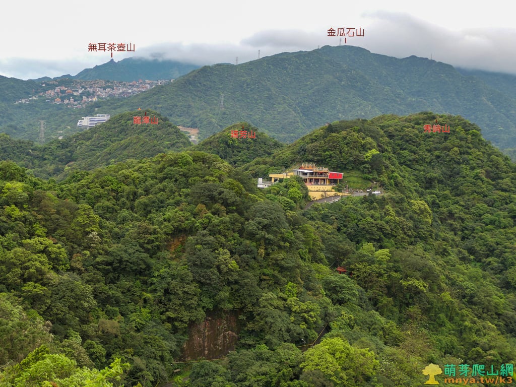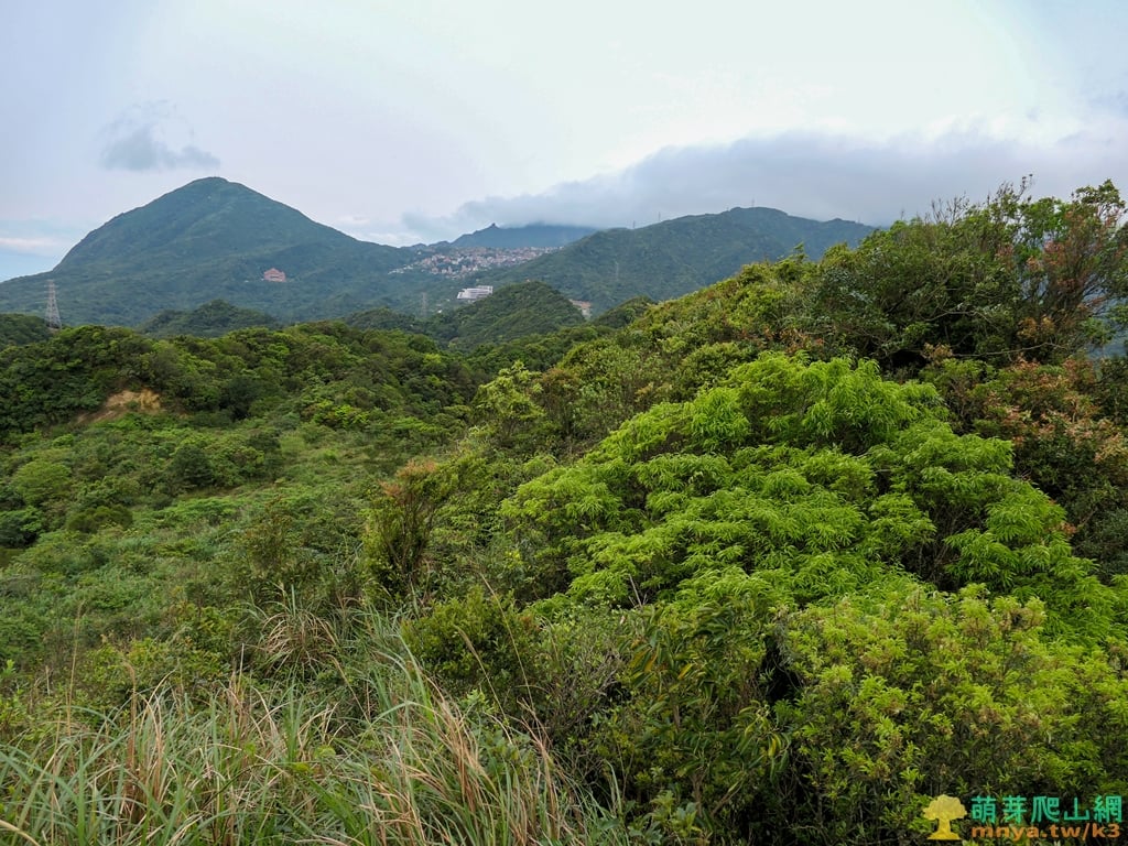 ▲往西拉近看大屯火山群方向,近處可見台北聖城與六坑山(182M);月眉山(215M)與天外天焚化廠煙囪,後一層山稜可見基隆七堵與新北萬里交界的開眼尖山(411M)至三界山(362M)連稜,最遠可見石梯嶺(862M)、七星山(1120M)、大尖山(837M)、大尖後山(885M)、磺嘴山(912M)、竹子山(1103M)等山。