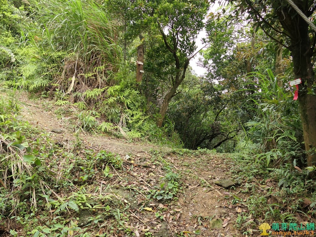 ▲經過電塔後直上後方山坡,馬上是急陡坡有架繩索。