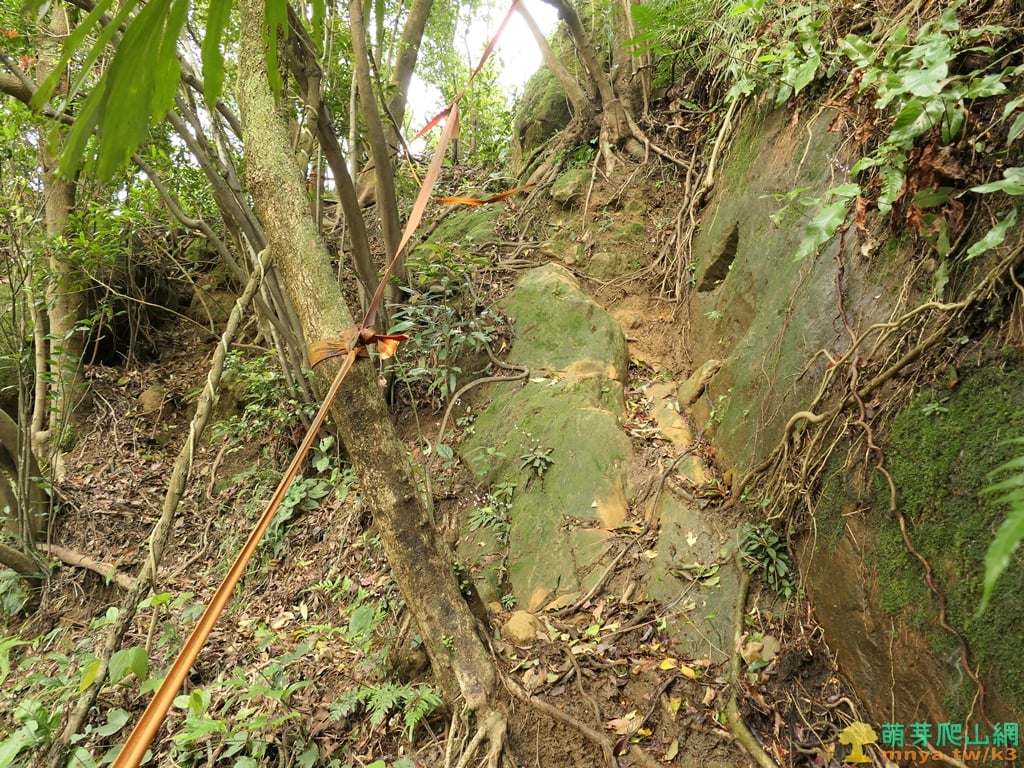 ▲陡上由石壁邊的斜坡拉繩上切,有踏點與拉繩、樹根慢慢走不難通過。