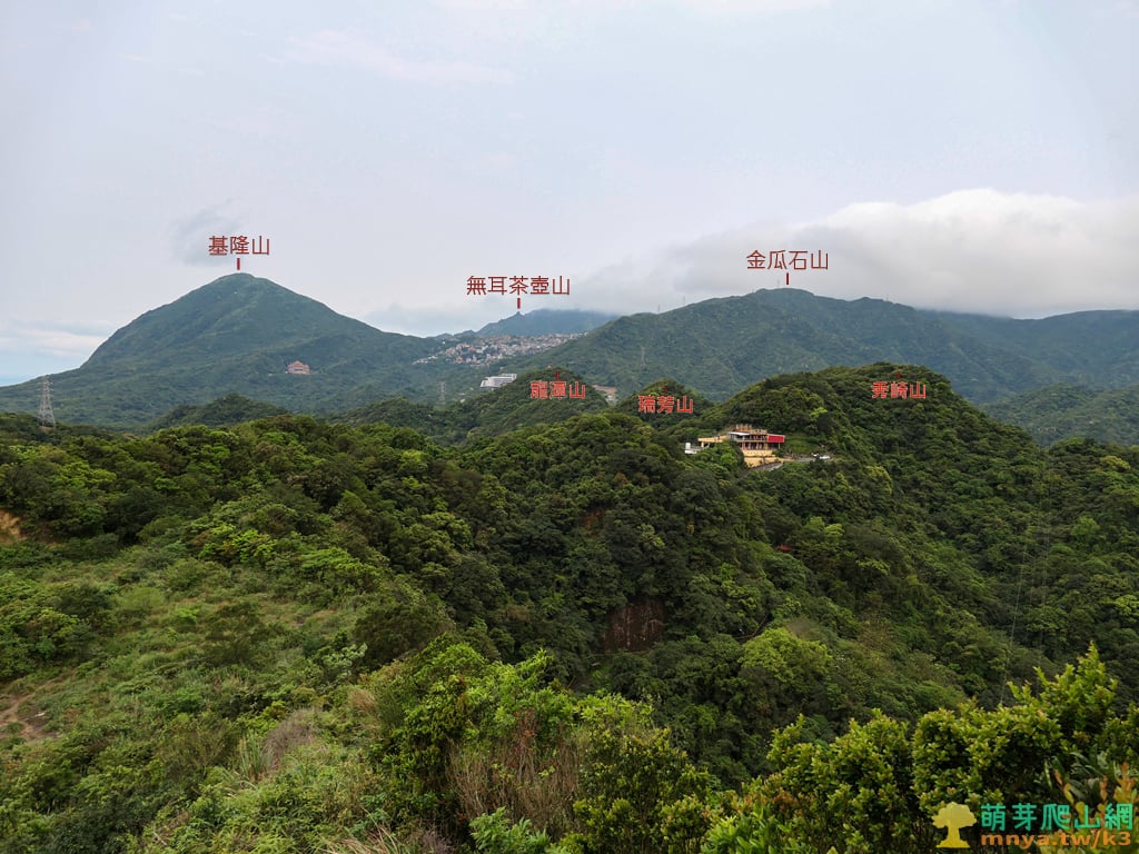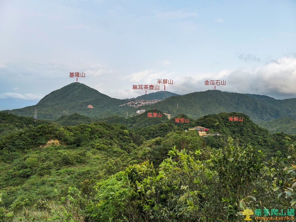 ▲向東南方向眺望,東側仍可見白象山延伸之秀崎山(195M)、瑞芳山(187M)、龍潭山(199M)連峰,合稱為「瑞芳四秀」,以及九份金瓜石地區的無耳茶壺山(602M)與半屏山(705M)、金瓜石山(576M),東南邊可眺望瑞雙公路不厭亭附近的三貂崙(540M),及連稜經金字碑古道的三貂嶺山(554M)、三貂大崙(523M)。
