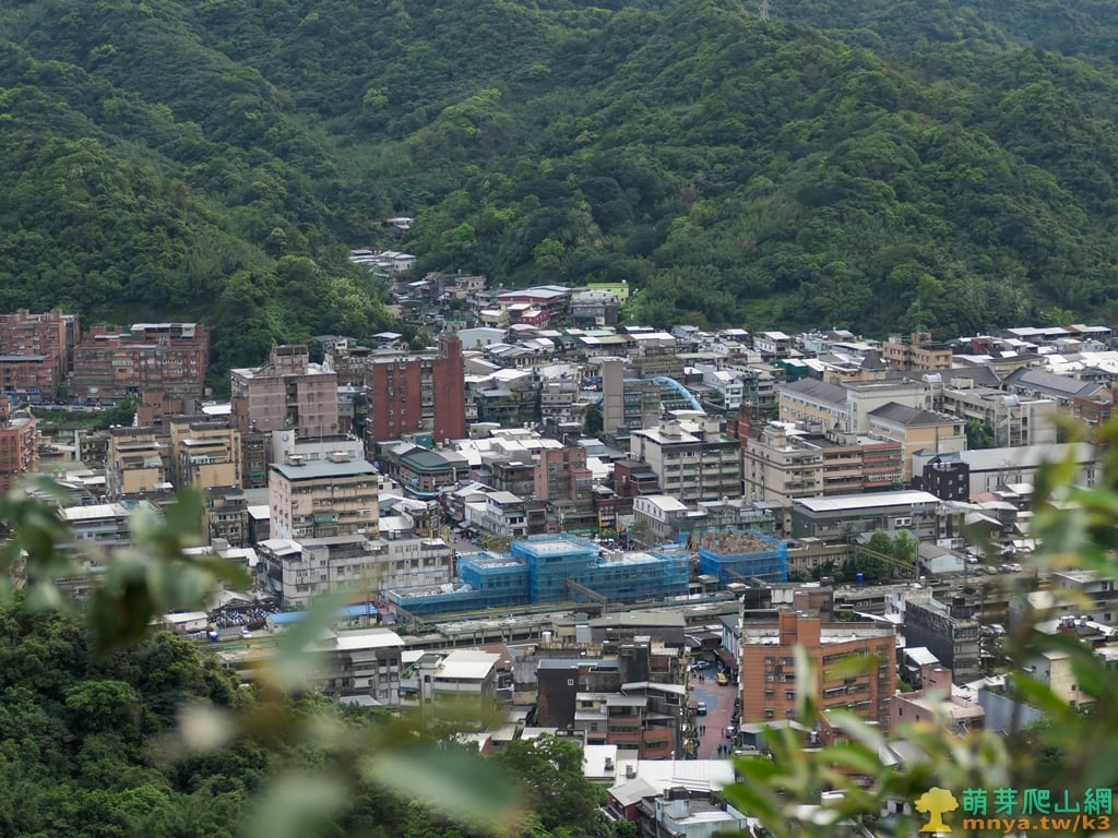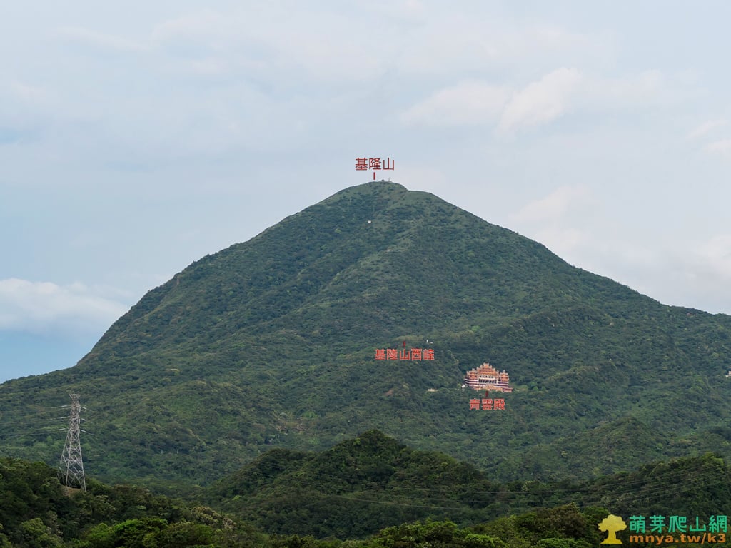 ▲拉近眺望九份北邊的基隆山(588M),是一座錐形死火山,山腰處可見青雲殿與一旁的基隆山西峰(253M)。