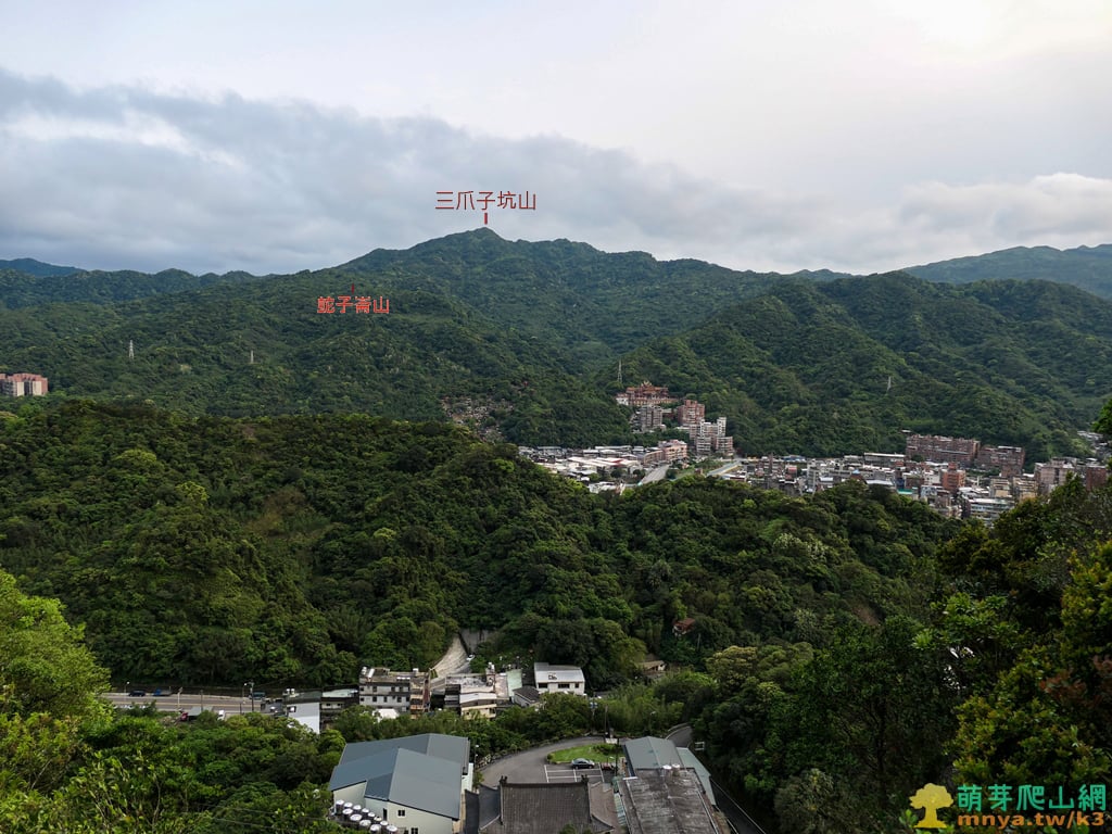 ▲往南俯瞰山下的弘明寺屋頂,下方可見基隆河與瑞芳市區、三爪子坑山坡上的瑞慈宮,河谷對面可見蛇子崙山(290M)至三爪子坑山(536M)連稜。