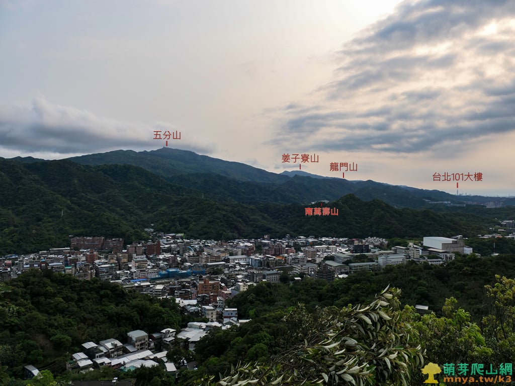▲往西南方向俯瞰山下的瑞芳市區,基隆河谷對面可見南萬壽山(135M)與萬壽山(178M)連稜,遠處可見五分山(757M)與向西延伸山稜上的姜子寮山(729M),兩山皆為小百岳,五分山西北側可見龍門山(380M),右側可遠眺位於台北信義區的101大樓。