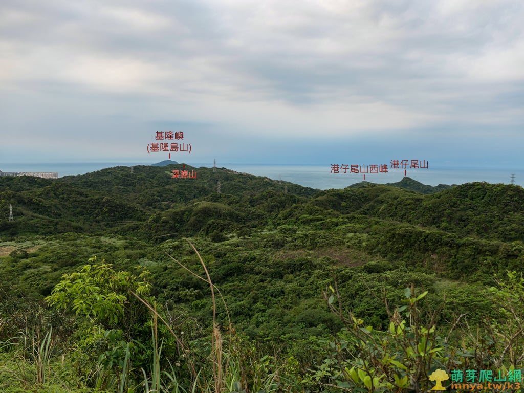 ▲往西偏北眺望基隆市區方向,後方山巒依序可見:大武崙山(231M)、丁火巧山(中幅子山;472M)、赤石六山(462M),最遠可見大屯火山群最北邊海拔過千的山峰 – 竹子山(1103M)。