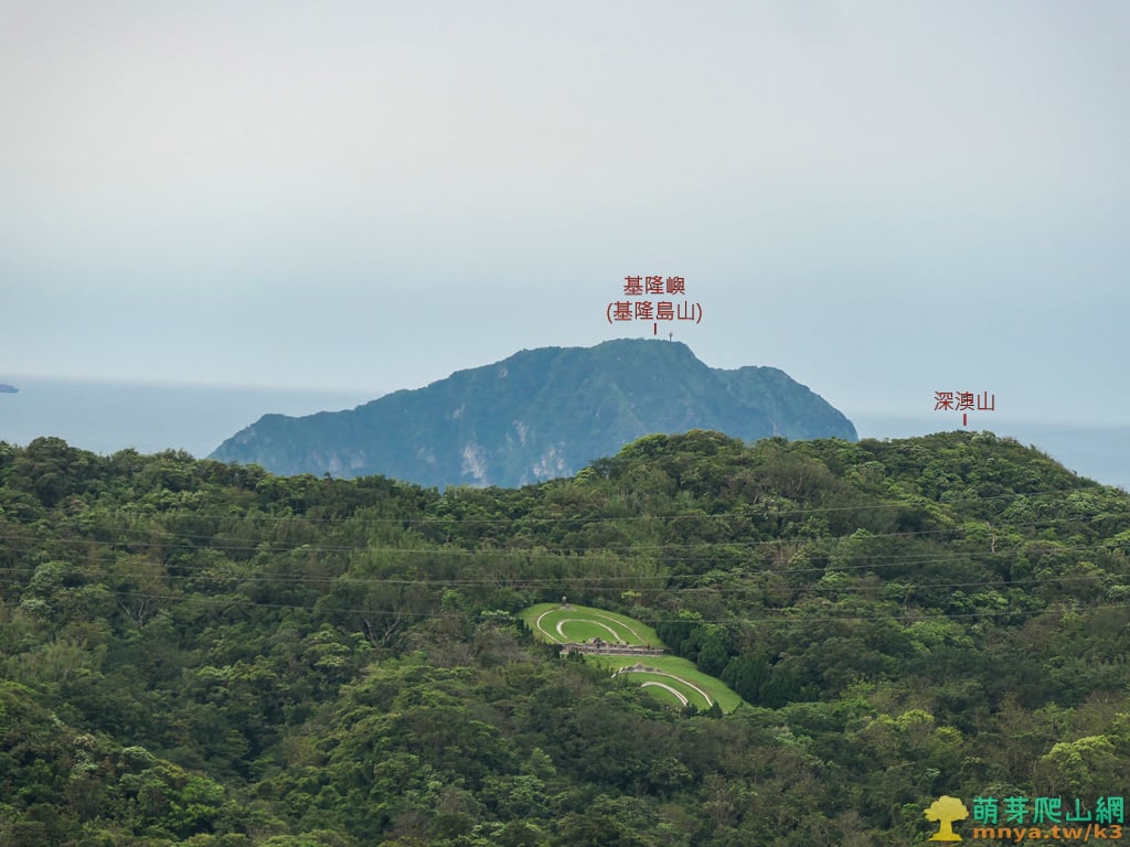 ▲往北拉近看深澳山(171M)以及山坡處的洪萬傳墓,山稜後方可見基隆島山(基隆嶼;182M),山頂可見基隆島燈塔。