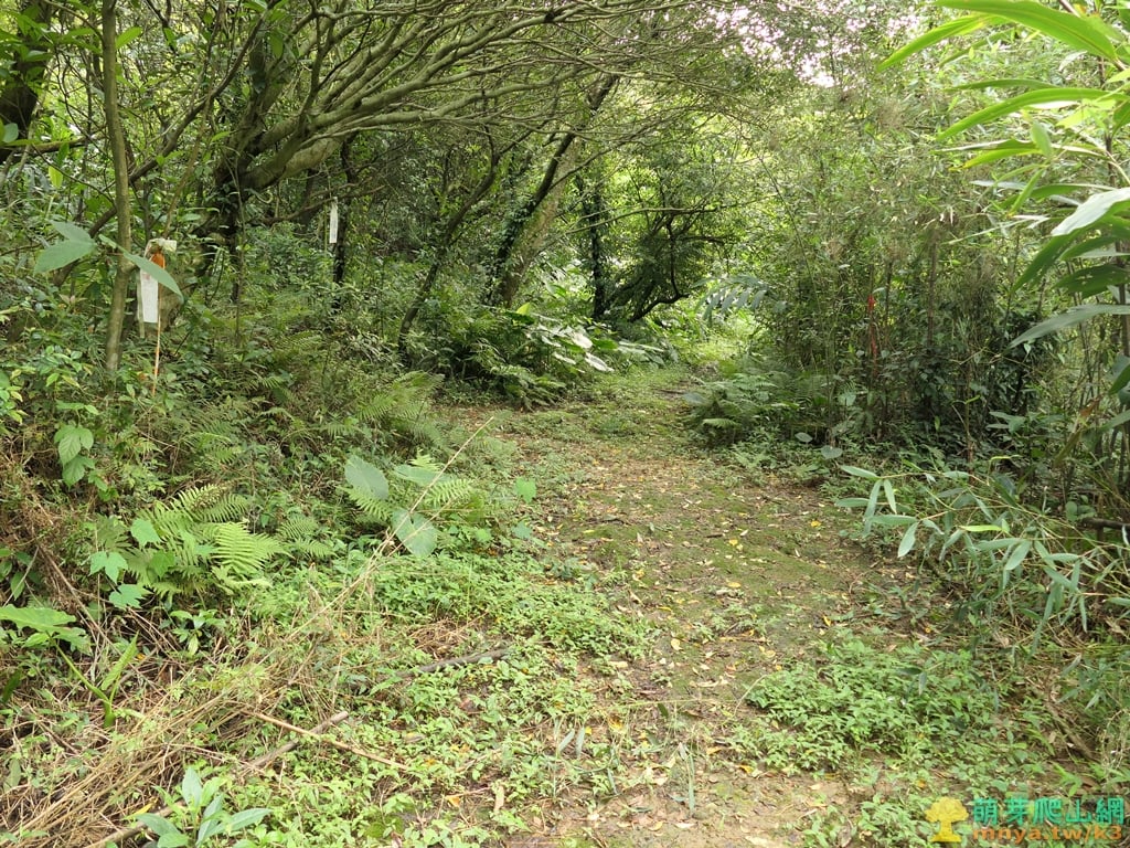 ▲沿山坡邊的廢棄產業道路緩上,路旁有「環大台北天際線第四段:瑞芳~基隆」猴雞縱走指標。