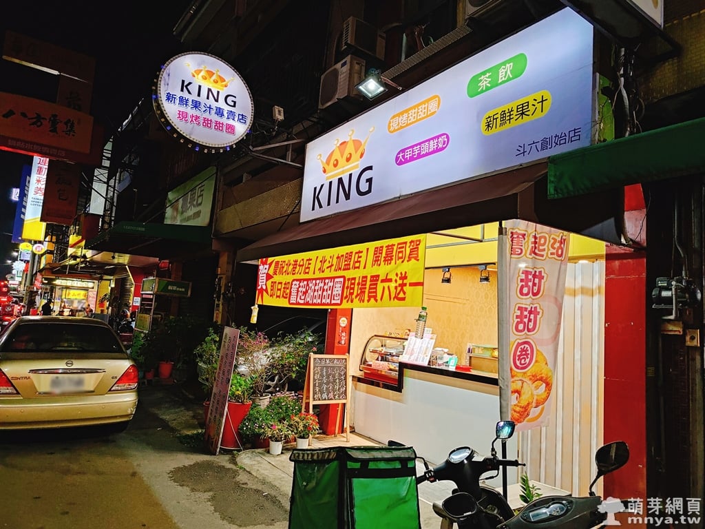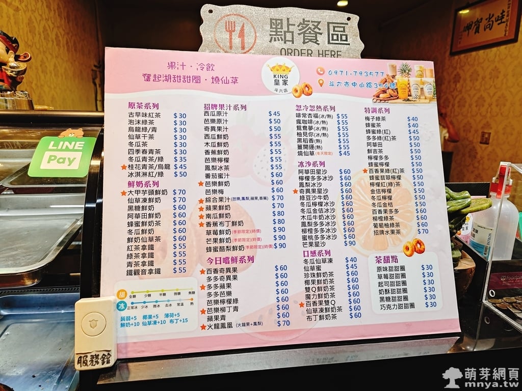 「KING皇家甜甜圈(斗六創始店)」位在中山路354號,即斗六市區內。店家有提供原茶、鮮奶、招牌果汁、今日嚐鮮、忽冷忽熱、冰沙、口感、特調系列飲料,還有原味、草莓、起司、奶酥、黑糖及巧克力口味的甜甜圈,飲料可以自訂糖度(全糖、少糖、半糖、微糖、無糖)與溫度冰量(正常冰、少冰、微冰、去冰、常溫、熱),還能加料(+5 元可加蒟蒻、椰果、薄荷;+10 元可加鮮奶、仙草凍;+15 元可加布丁),選擇多,價位中等,先付款 💸,無發票 🧾,可現金或 LINE Pay 付款,結帳後等待飲料現做,製作速度快。無內用,外帶為主。