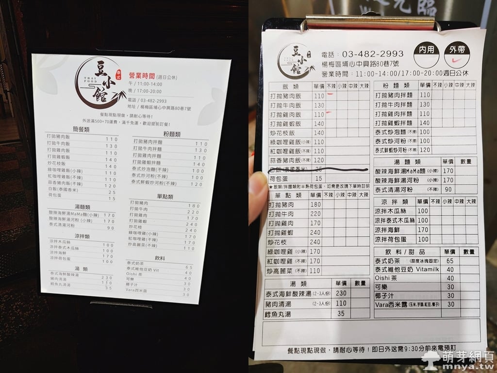 「豆小館泰式料理」位在中興路80巷7號,即埔心市區內。店家提供飯、粉麵、湯麵、涼拌、飲料、甜品和單點等,選擇多,為一家泰式小吃店。有菜單可劃記,外帶先付款 💸,價位中等,無收據及發票 🧾。有內用空間。現點現做,約 10 ~ 15 分鐘的等候時間。