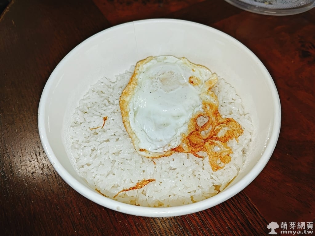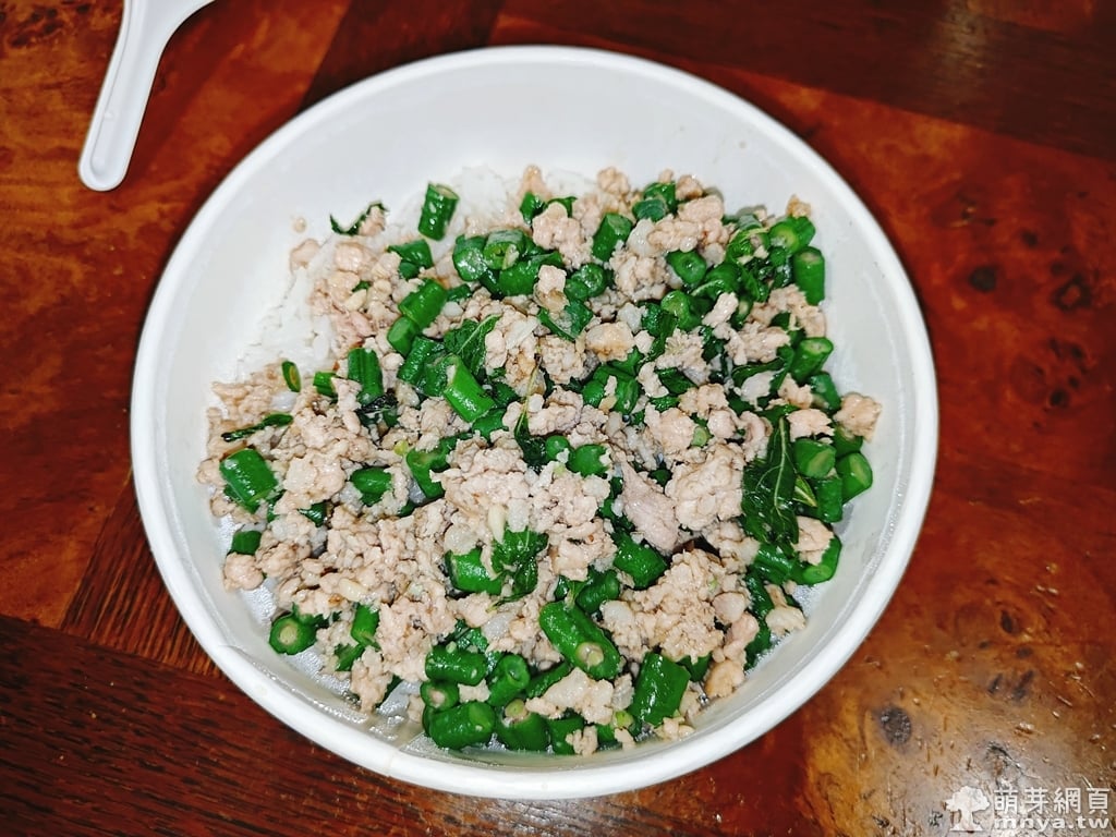 我點「打拋豬肉飯(110元)」,配料與醬汁放在上層,有切段四季豆與炒得入味的豬絞肉,下面則是白飯和一顆荷包蛋,可以依照個人口味混合一起吃,份量足,口感佳,好吃 😋,可吃飽;我弟點了「打拋雞肉飯(110元)」,配料和擺盤方式也類似,使用雞絞肉炒製,味道一樣很讚,也非常下飯。