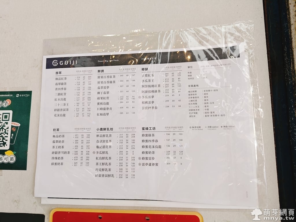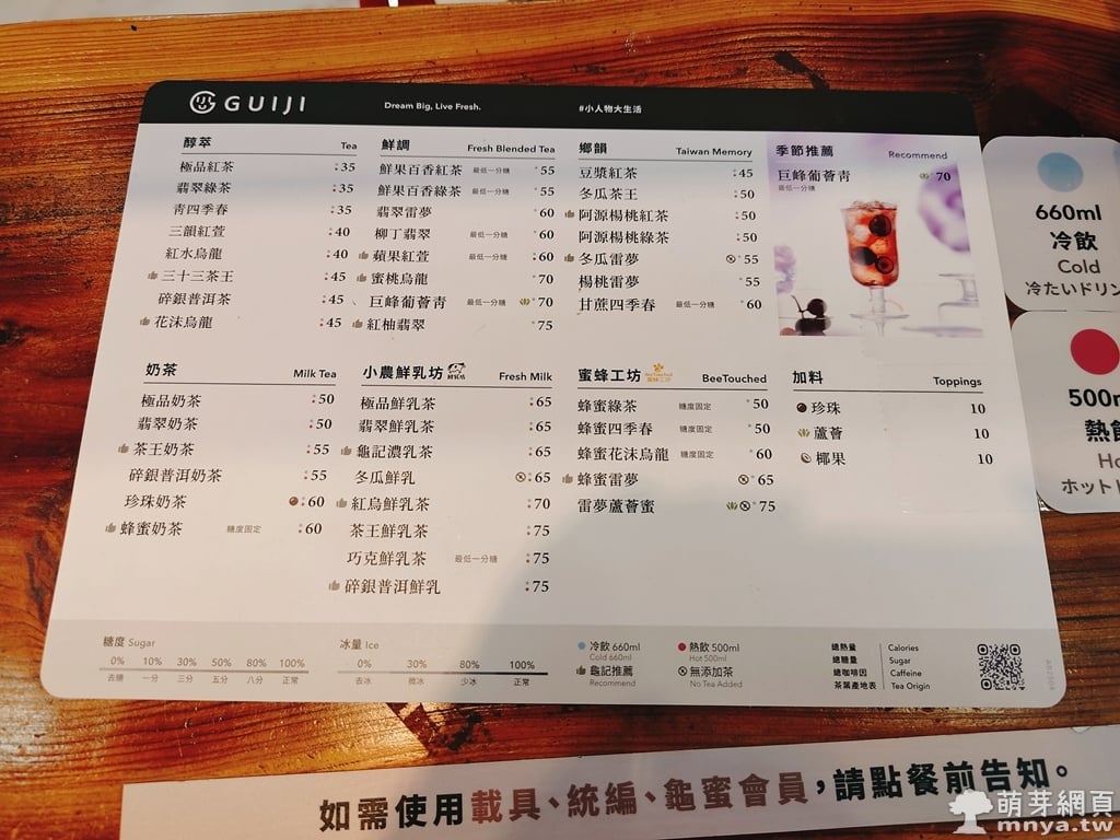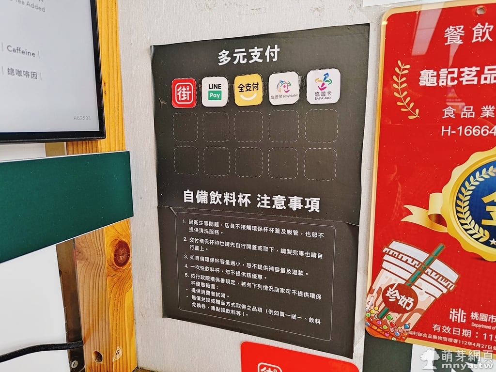「龜記茗品(楊梅大成店)」位在大成路145號,楊梅市區內,靠近楊梅火車站。店家有提供醇茶、奶茶、鮮調、小農鮮乳坊、鄉韻、蜜蜂工坊及季節推薦系列飲料,可以自訂糖度(去糖、一分、三分、五分、八分、正常)與溫度冰量(去冰、微冰、少冰、正常、熱飲),還能加料(+10 元有珍珠、蘆薈、椰果),選擇多,價位中等,先付款 💸,有發票 🧾,可刷行動支付(街口支付、LINE PAY、全支付等),結帳後等待飲料現做,製作速度快。無內用,外帶為主。