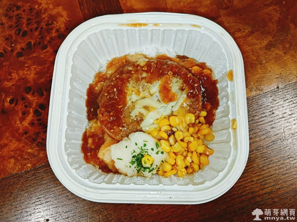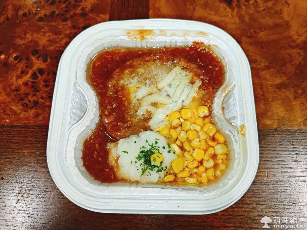 ▲ 白飯在下層,倒入上層配料後香氣四溢,起司融化在漢堡排上,搭配玉米與馬鈴薯泥,口感層次豐富。