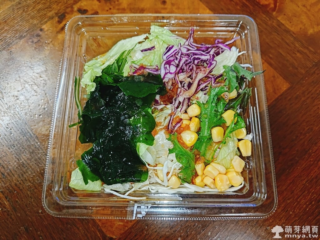 ▲ 拆開沙拉盒,可以看到各種蔬菜與海藻,配色新鮮,玉米粒讓整體多了點甜味,搭配自選的免費沙拉醬吃。