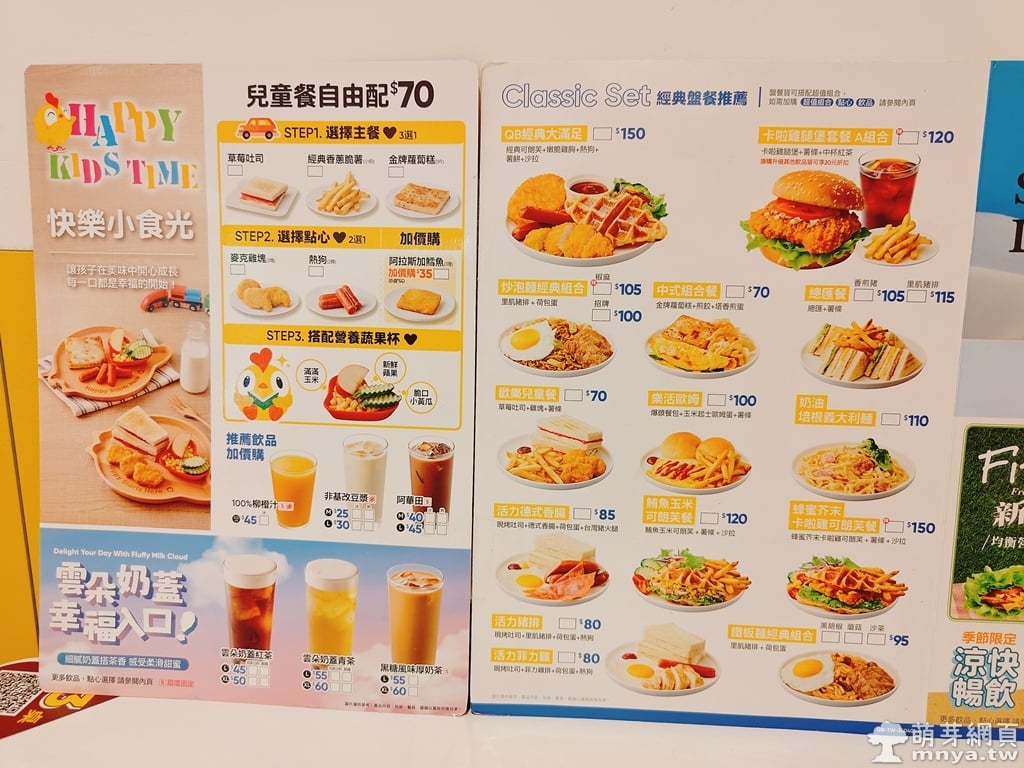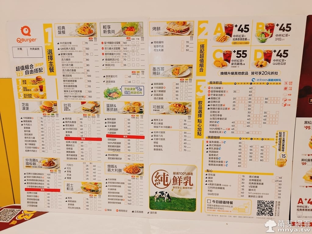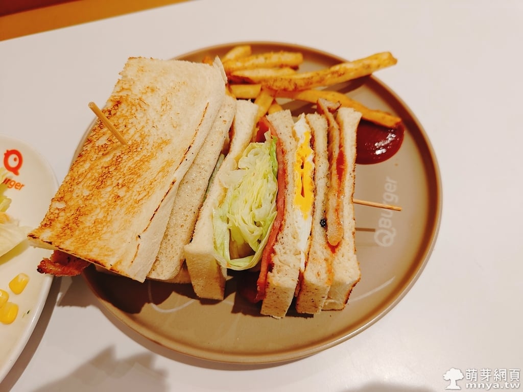 「Q Burger 平鎮新富店」位在新富五街41號1樓。店家賣芝麻漢堡、炒泡麵、鐵板麵、經典盤餐、吐司、起士軟法、輕享新食尚、蛋餅、蔥抓餅、燉飯、義大利麵、烤餅、墨西哥捲餅、可朗芙、點心、飲品和咖啡等,選擇非常多,為一家連鎖早午餐店。有點餐單,價位中等,可使用 APP 掃碼點餐,支援線上支付 💸,我使用 LINE Pay 直接支付就不用在櫃台排隊結帳了!有發票、收據 🧾,有內用空間,環境明亮且乾淨,座位很多,餐具、醬料自取 🥢。送餐速度超快,約 5 分鐘內餐點全送上。店內有廁所可使用。