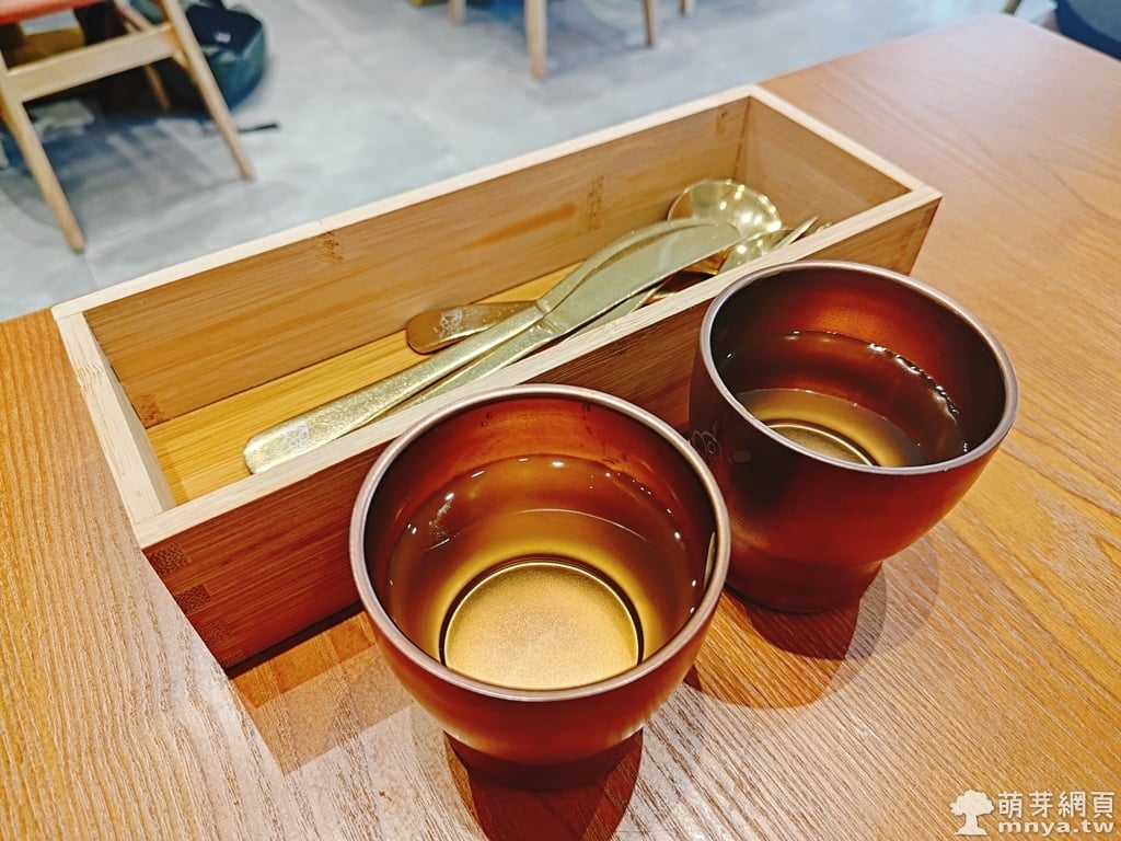 ▲ 每桌都會附上自助餐具盒和茶水,金色餐具質感很不錯。