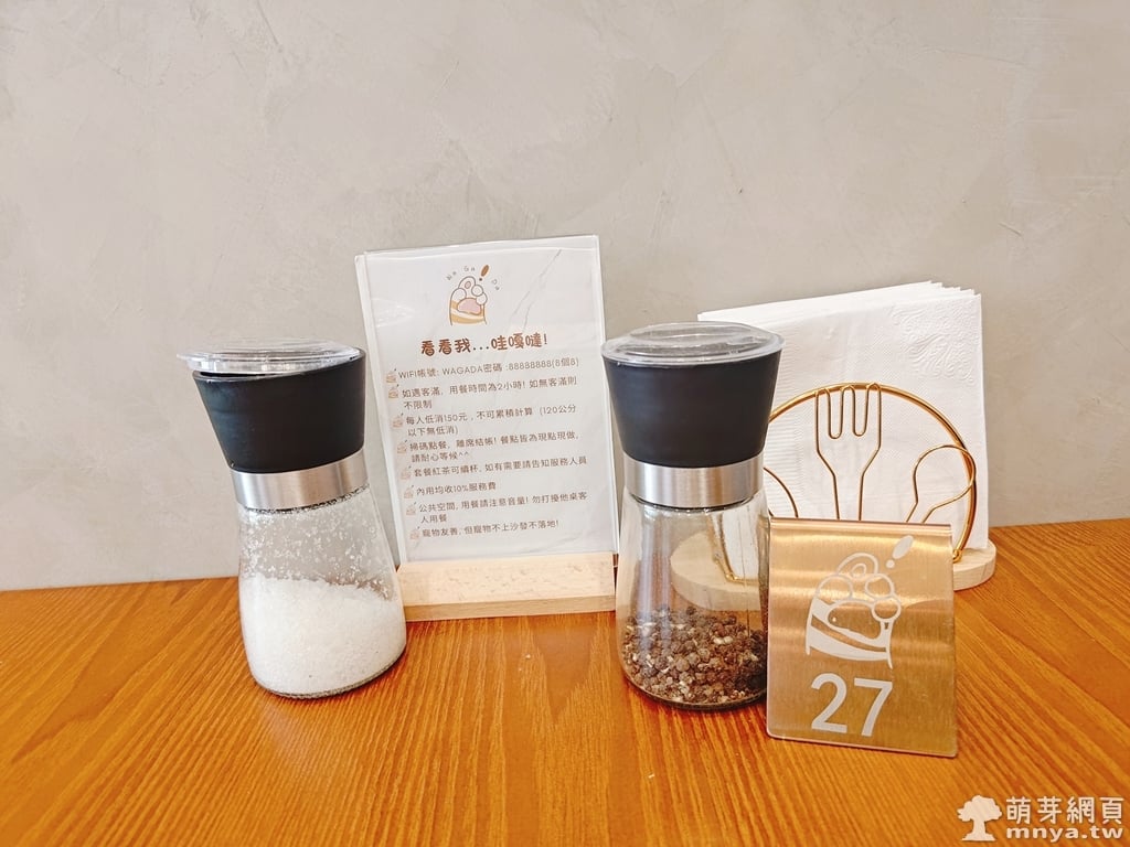 「哇嘎噠WAGADA」位在青埔七街1號,即青浦一帶內。店家提供早午餐拼盤、法式吐司、丹麥吐司三明治、竹炭黑漢堡、義大利麵/燉飯、咖哩飯、現烤排餐、健康沙拉、兒童餐、炸物、手作甜點、花草茶、咖啡、現泡茶、歐蕾牛奶等,選擇非常多,為一家早午餐店。有菜單可參考,價位中等偏小貴,掃碼登記內用候位及點餐,內用完至櫃台付款 💸, 可使用 LINE Pay,有發票 🧾,可刷載具。有內用空間,環境明亮且乾淨,夏日冷氣很強 ❄️,座位多,有一樓跟二樓,餐具都會隨餐附上 🥢,需要也能請服務人員提供,因此會加收服務費 10%。送餐速度不算很快,不過這種類型的店通常都是慢慢享受所以還好,約 25 分鐘內餐點全送上。店內有廁所可使用,在二樓。