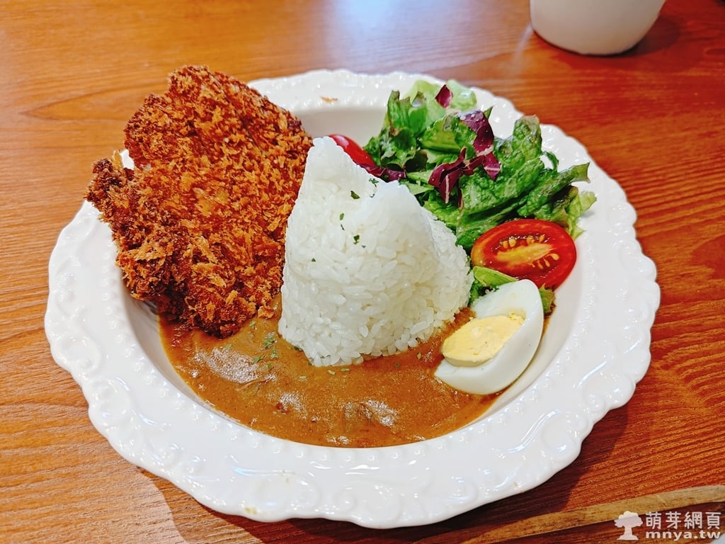 ▲ 主餐「日式豬排咖哩飯」豬排超酥脆,貓咪造型白飯超可愛,附沙拉和水煮蛋,擺盤用心。