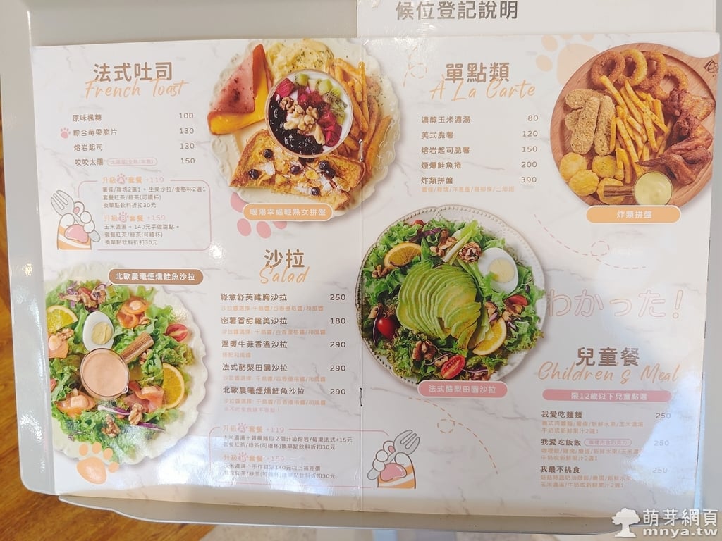 ▲ 另一頁菜單有法式吐司、沙拉、炸物拼盤及兒童餐等,配色繽紛,擺盤也很吸引人。