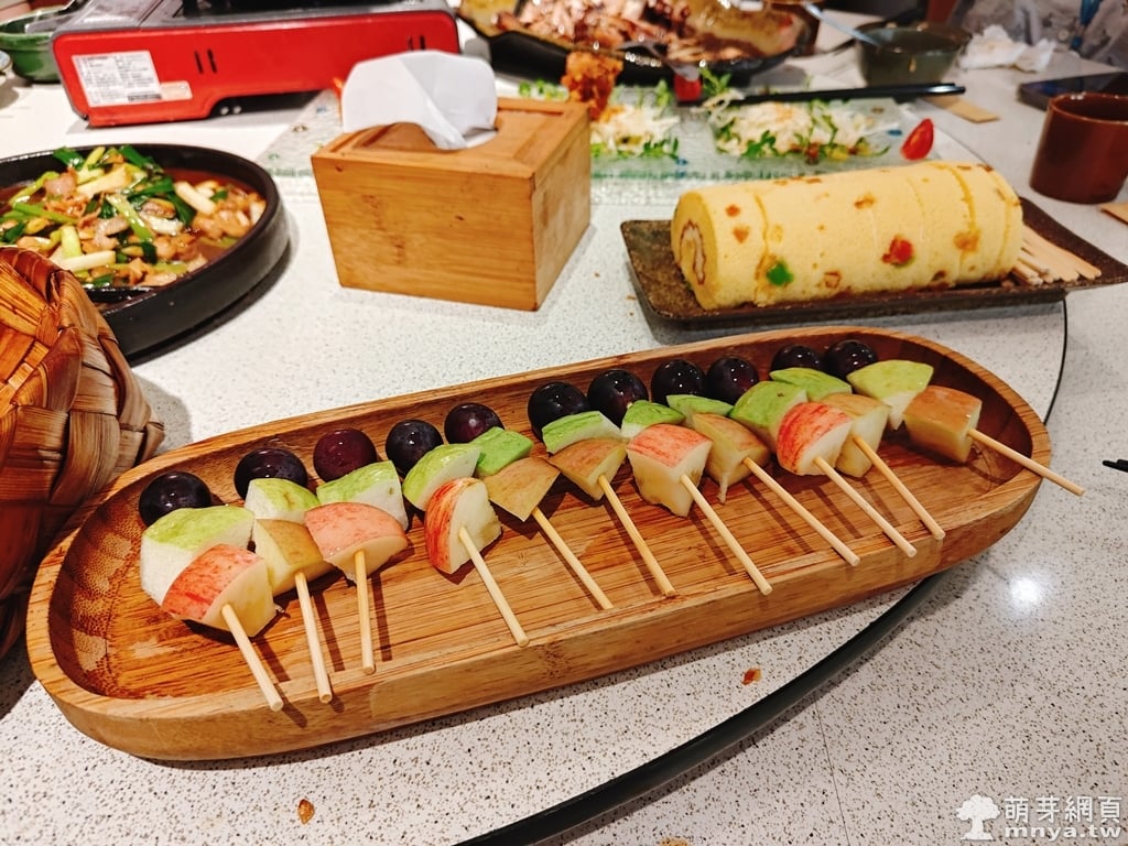 ▲ 飯後水果與瑞士捲,水果串搭配葡萄、蘋果與芭樂,清爽解膩,瑞士捲則是甜點收尾。