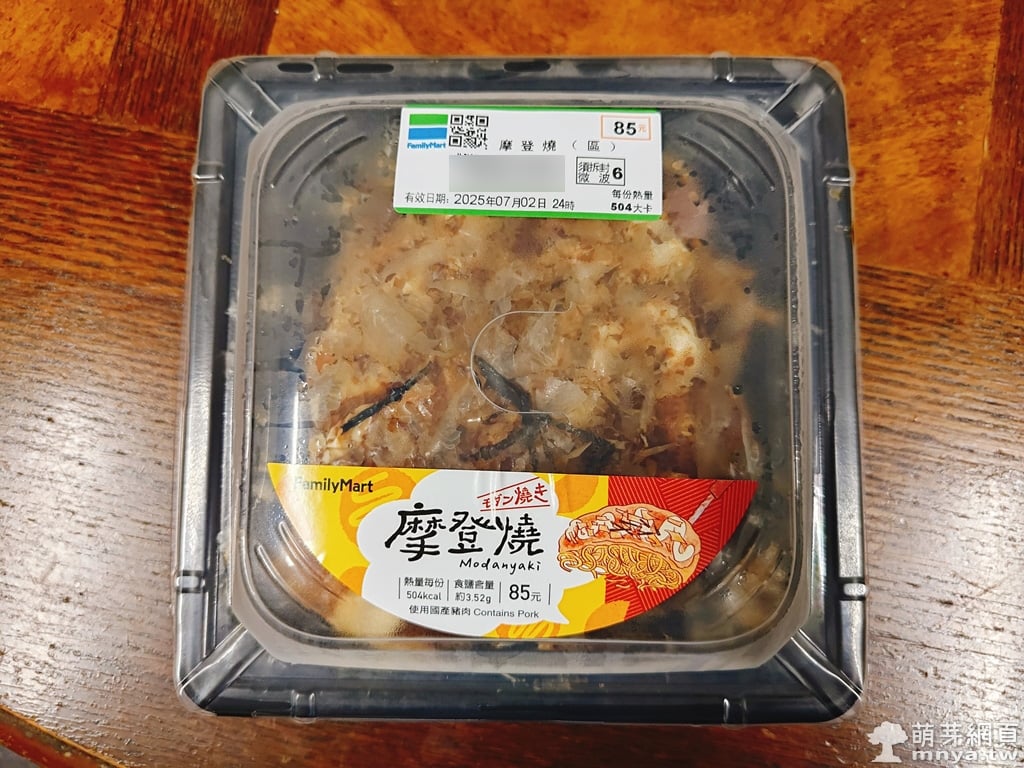 宵夜繼續全家!剛好有友善時光的 7 折優惠,忍不住又來挖寶。這回我選了「蔥鹽雞肉麵沙拉(原價 79 元)」,主打清爽低負擔的沙拉搭配螺旋麵、嫩口雞胸與經典蔥鹽醬,紙盒包裝裡還能看到生菜、紫洋蔥、胡蘿蔔絲,營養與飽足感兼顧。我弟則挑了區域限定的「摩登燒(原價 85 元)」,大阪燒的進化版,最明顯的差別就是多了一層炒麵,光用看的就很有份量,醬料香氣與高麗菜、炒麵融合,完美詮釋碳水的療癒魅力。兩人還順手入手了今年初新登場的「春水良品-白桃芒芒鮮果茶(59 元)」,剛好遇上第二件只要 +10 元的活動,直接帶兩瓶回家。這款飲料據說主打白桃香甜和芒果果香交織,還用 HPP 冷高壓保鮮技術,喝起來清爽不膩,果香和綠茶韻味都有顧到。