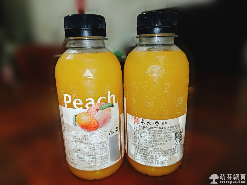 🥤 春水良品-白桃芒芒鮮果茶:熱量 171.2 大卡、450 毫升,售價新台幣 59 元。