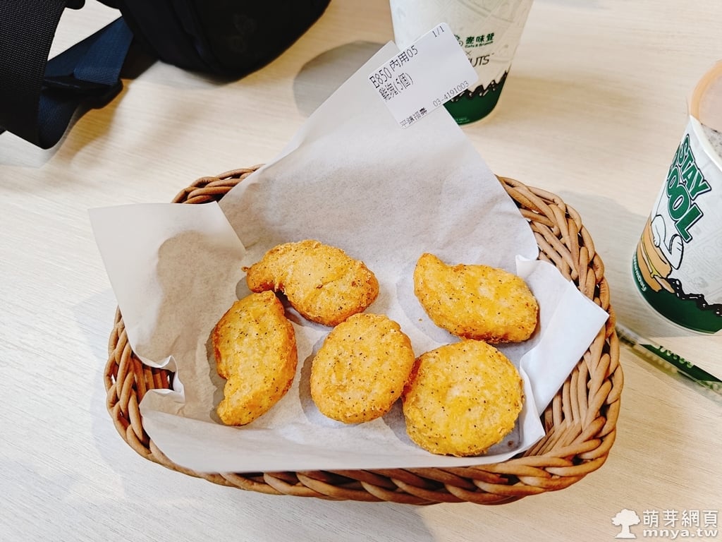 我點「原塊嫩雞起司可頌(升級套餐 B:雞塊5個、錫蘭紅茶[M,冰],155元)」,份量足,可吃飽,口感佳,好吃 😋;我弟點了「蘿勒燻雞三明治特餐(125元)」及「錫蘭紅茶(M,冰,20元)」,特餐有蘿勒燻雞三明治、炒蛋、脆薯,份量適中,可吃飽。