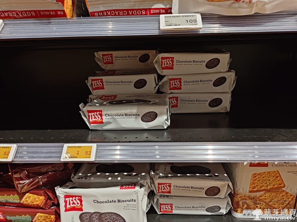 ▲ ZESS 巧克力餅乾陳列在超市架上,標價 52 元新台幣,外包裝採用簡潔白色設計,非常容易辨識,放在東南亞餅乾區裡特別顯眼。