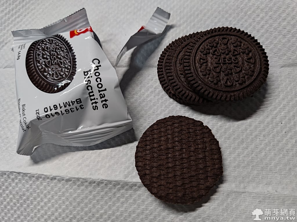 ▲ 每一小包裡有四片巧克力餅乾,外觀有點像 OREO,咬下去香脆不甜膩,是大人小孩都能接受的經典巧克力味。