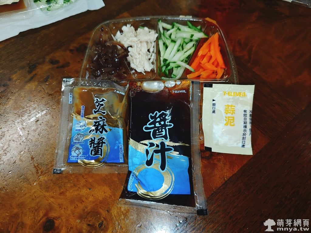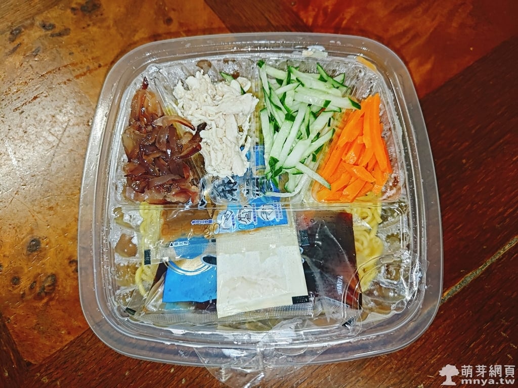 ▲「極饗-肉燥涼麵」有肉燥、小黃瓜絲,同樣附有三包醬包,分別是芝麻醬、醬汁跟蒜泥。