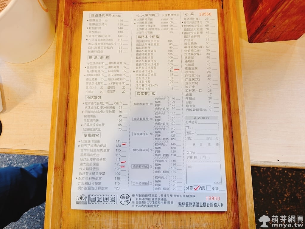 「台灣火車頭鐵路便當(平鎮門市)」位在中豐路山頂段179號,即山子頂一帶。店家提供熱炒、小吃、湯品、小菜、飲料、鐵路木片便當、鐵路木片幸福便當、便當組合(大便當),為一家連鎖便當店。有價目表、點餐單,可口頭或劃記點餐,櫃台先付款 💸,現金ONLY,無發票 🧾,有內用空間。我們外帶,稍微等約 3 ~ 5 分鐘便當就裝好了。