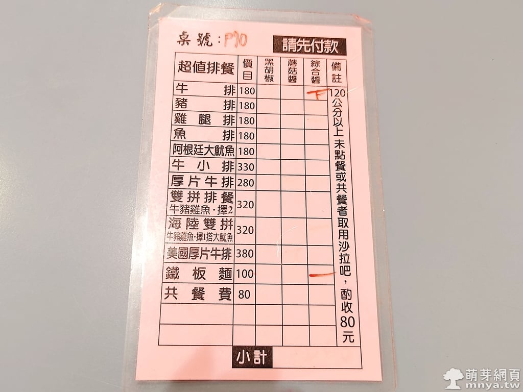 我點「牛排(綜合醬,180元)」;家人點了「牛排(綜合醬,180元)」X2 和「鐵板麵(綜合醬,100元)」。價格相當便宜!沙朗牛排的部分是原肉,肉質不錯,肉嫩好切!麵條是扁麵而非黃麵,有荷包蛋,很好吃 😋,加上有自助吧可以自取沙拉等,絕對可吃飽飽,CP 值可說是相當高,非常經濟實惠!推薦給大家 👍。